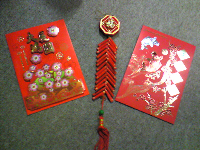 写真に載せたのがそれ。所謂、年賀状みたいなメッセージカード2通と爆竹っぽい飾り物。