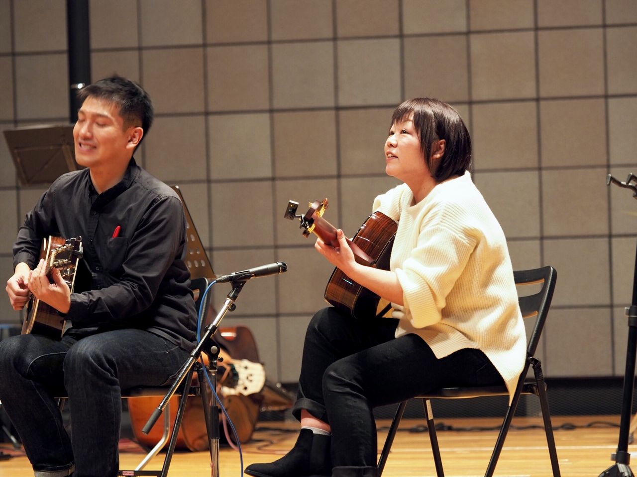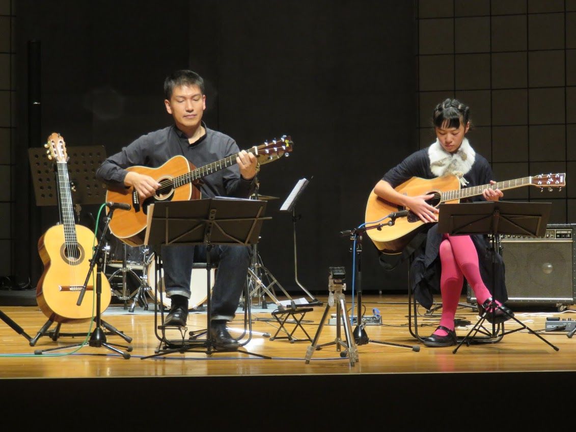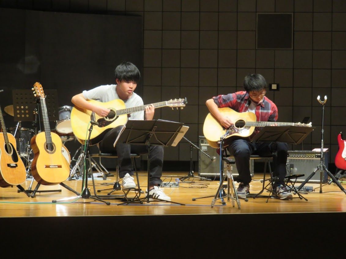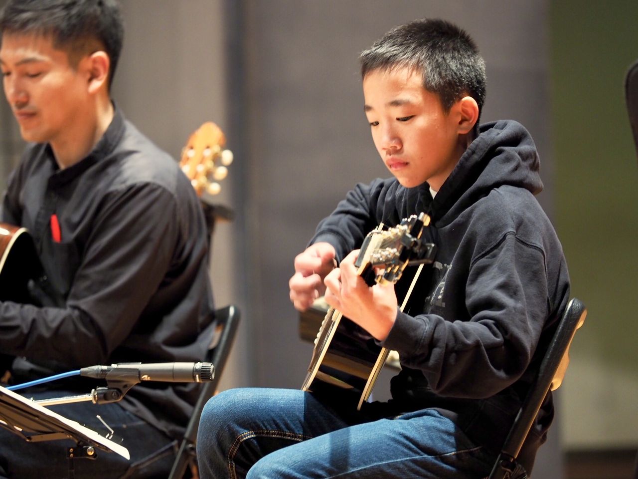 今回初の試み、生徒さん同士の二重奏。実は二人は同じ学校の先輩後輩の間柄。写真左側のTくん(先輩)は今年始めたばかり。今回の曲は彼が入会当初からやってみたいと言っていた曲。セーハの多い曲だったので大変だったかと思いますが、短期間でよく頑張りました。一方写真右側のKくんは今回で5回目の発表会。終始落ち着いていて流石でした。今までは伴奏メインでしたが、今回始めてメロディーを最初から最後まで弾いてもらいました。歌のニュアンスを出すのに苦労したかと思いますが、良い音色でした。ヒヤッとするところもありましたが、諦めず止まらずやり直さず、最後まで息の合ったいい演奏でした。