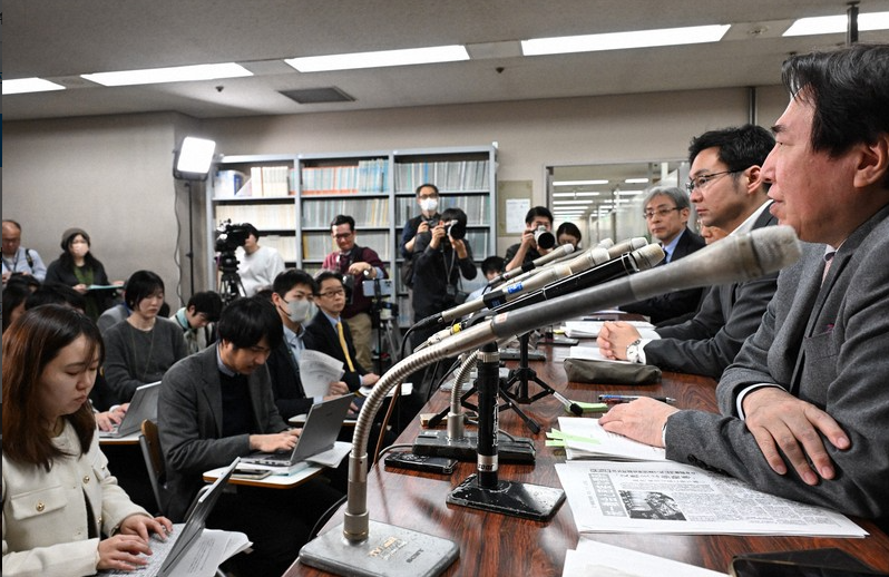 世界平和統一家庭連合(旧統一教会)の解散を命じた東京高裁決定を受け、記者会見する紀藤正樹弁護士(右手前)ら全国霊感商法対策弁護士連絡会=東京都千代田区で2026年3月4日午後2時9分、西夏生撮影