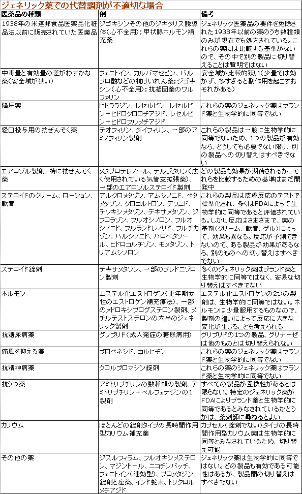 アメリカ、FDAではジェネリックへ先発品から切り替えないほうが良い品目を示しています。