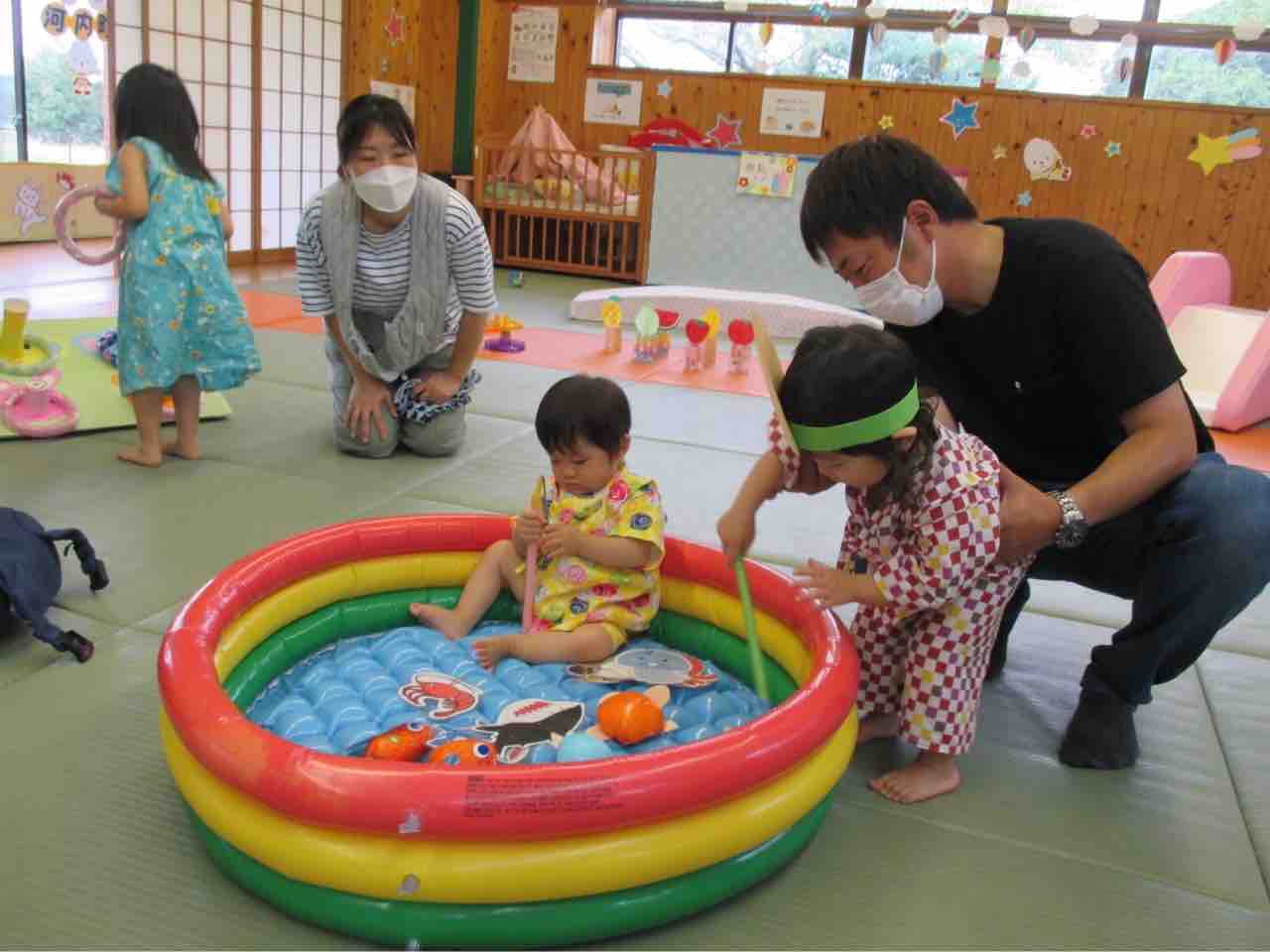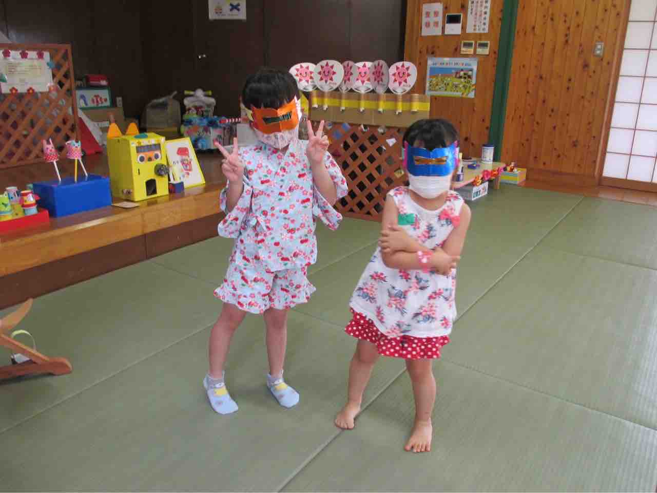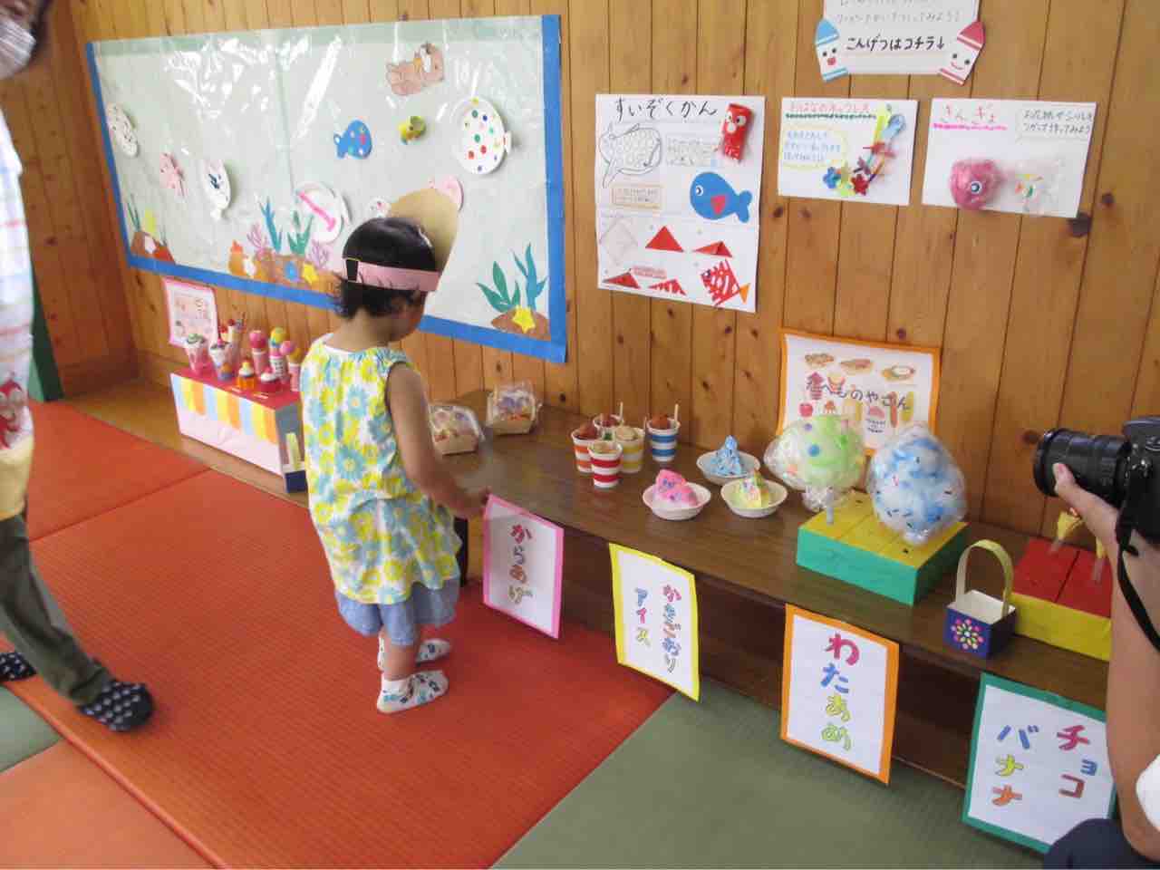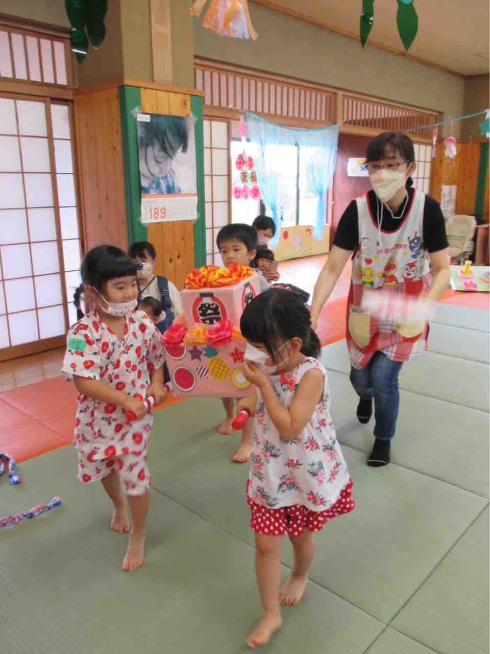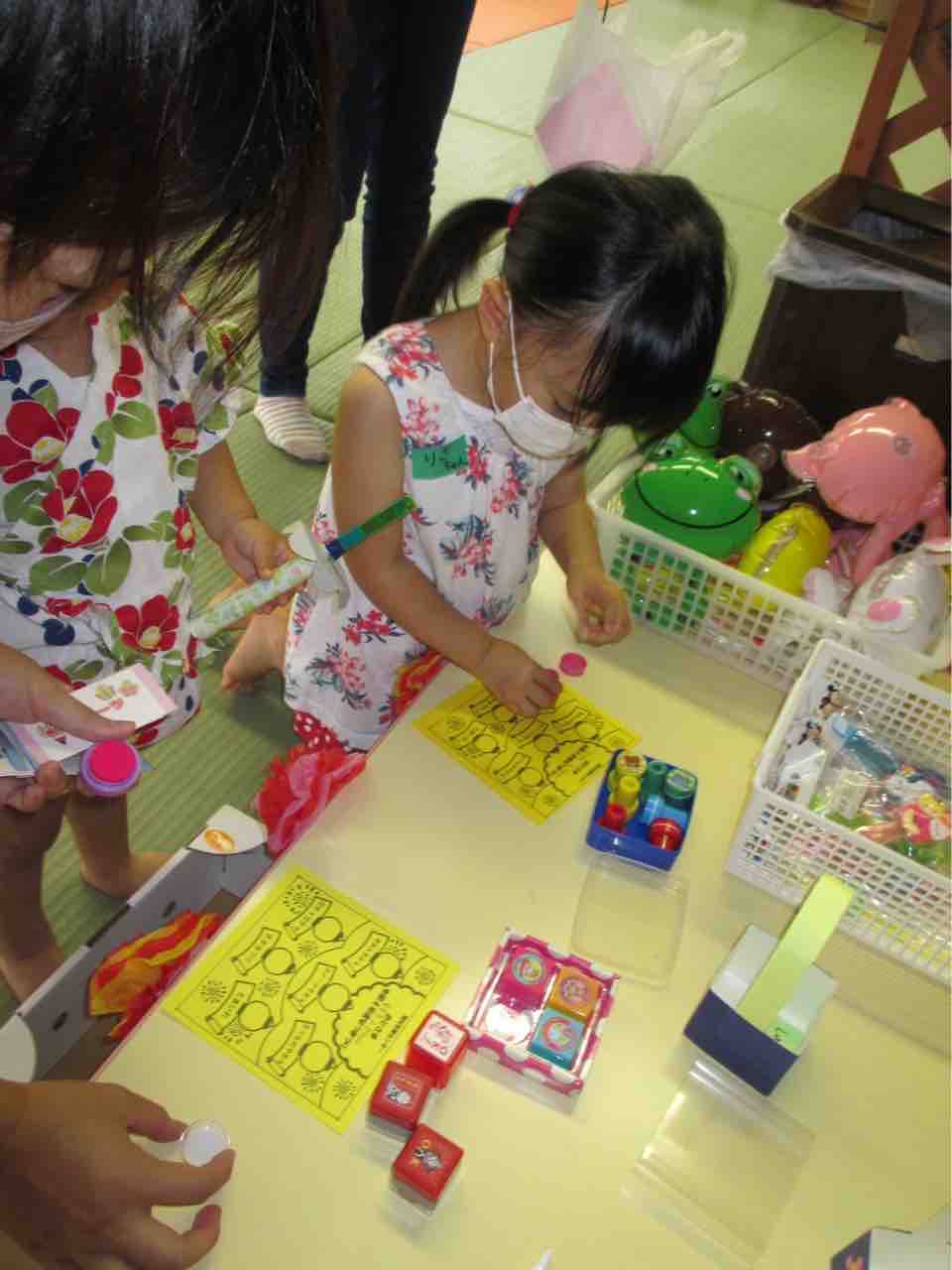 8月に「お祭りごっこ」を開催しました。ガチャガチャ、おめん屋さん、スイーツ屋さん、魚釣り、食べ物屋さん、玉入れなどなど楽しいお店がいっぱいでした。素敵なうちわを作ってお祭りに参加しました。おみこしや山車も楽しんでいました