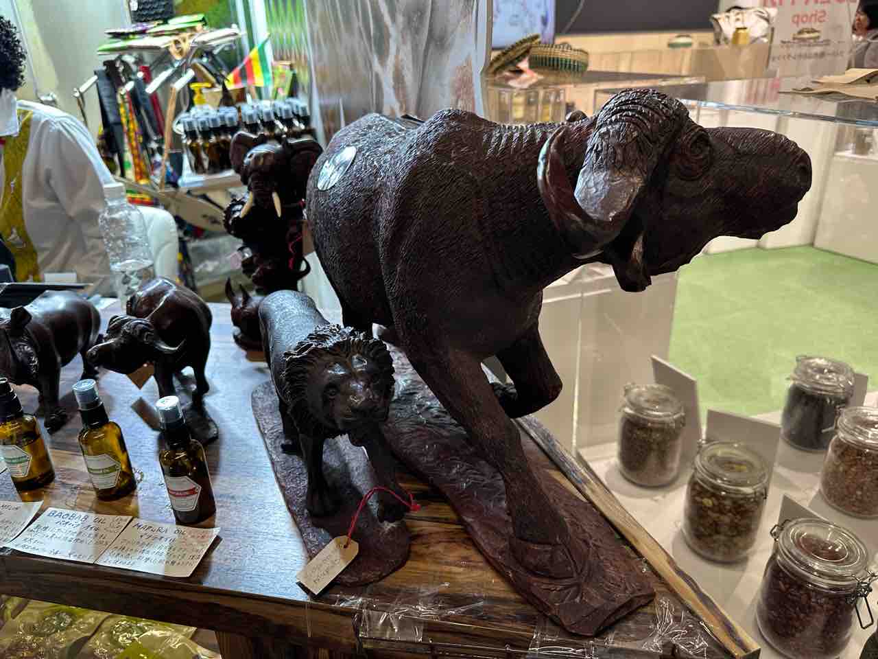 ジンバブエの工芸品ブース。動物を木彫りで彫りたくなってしまうのは人間の性なのだろうか。