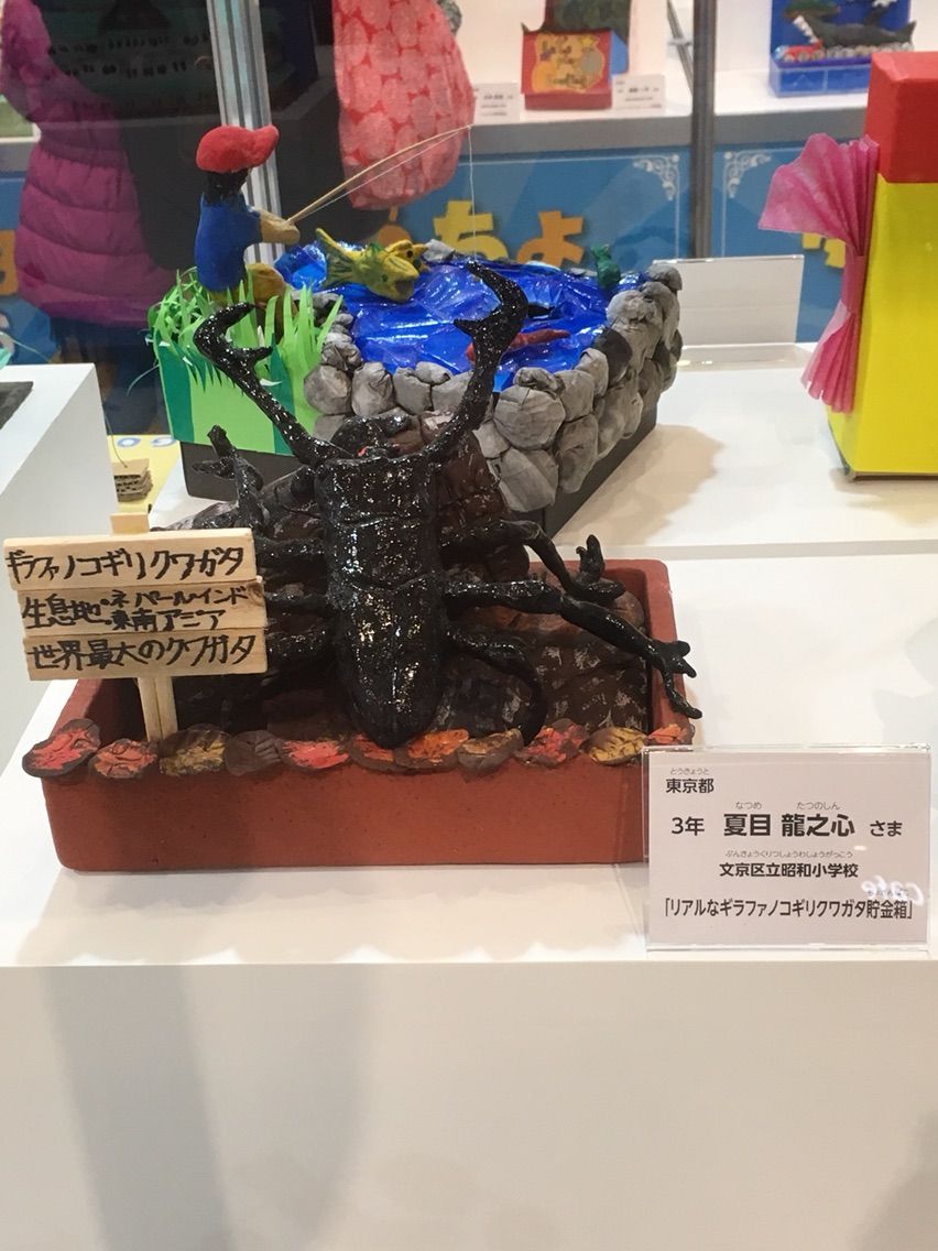 夏休みに小学生が作るゆうちょ銀行主催のアイディア貯金箱の展示会の季節!夏休みに提出して約半年後。全国から約5万点の作品が集まり絞りに絞られた約240点の作品が東京、大阪、愛知等全国6ヵ所のイオン(へんぴな場所にある)で2,3日間(たった)展示されるのです!