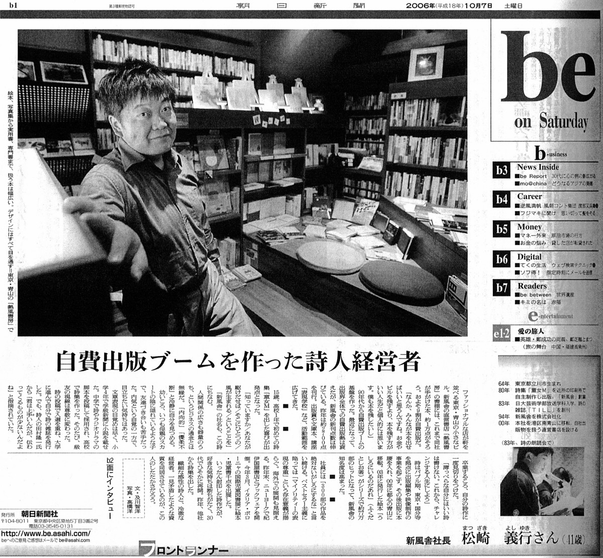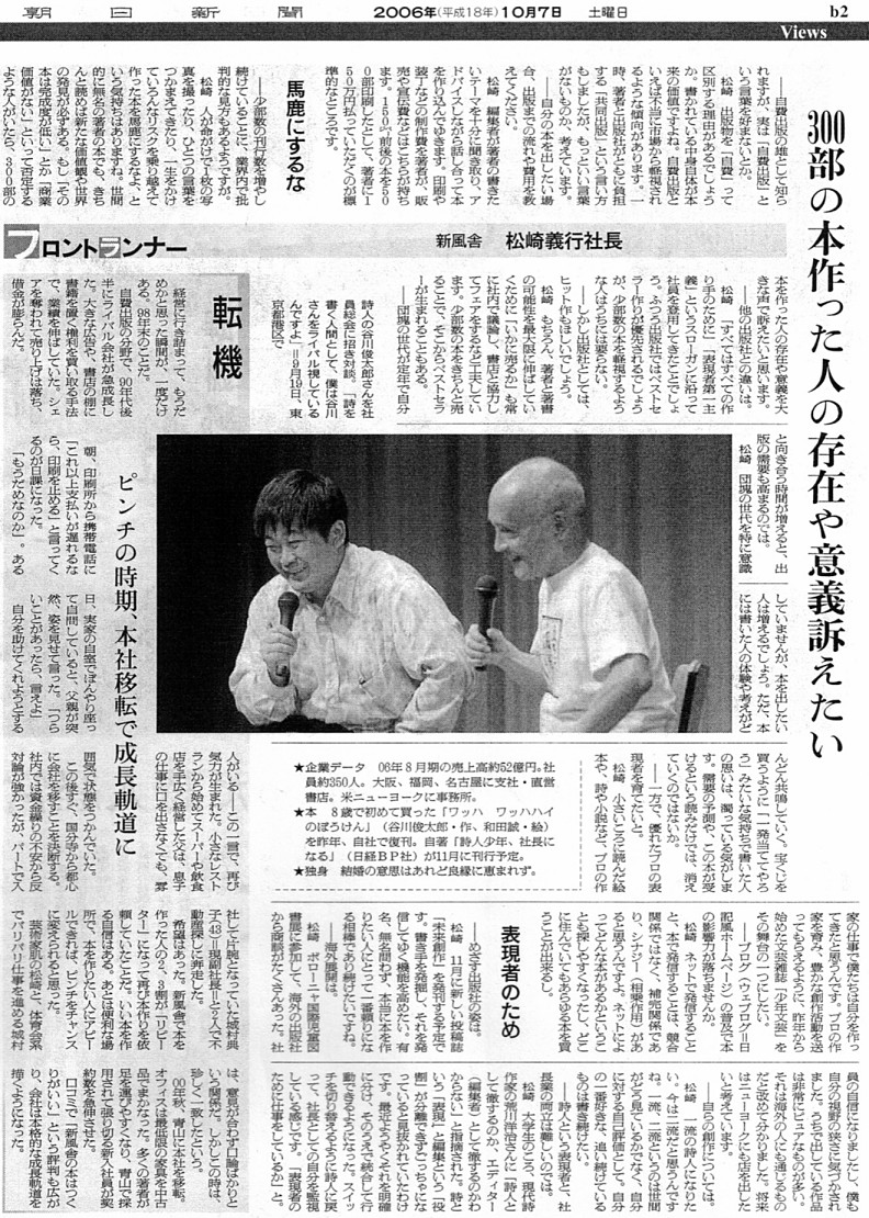 しかし、新風舎をもて囃していたのは朝日新聞だけではありません。読売新聞でも『「新風舎」松崎義行さんに聞く 存在感増す「共同出版」』(2006年8月3日)、『詩人少年、社長になる』(2006年12月6日)といった記事を掲載しています。松崎社長に注目したのは、朝日よりも読売の方が時期的には早いくらいです。
