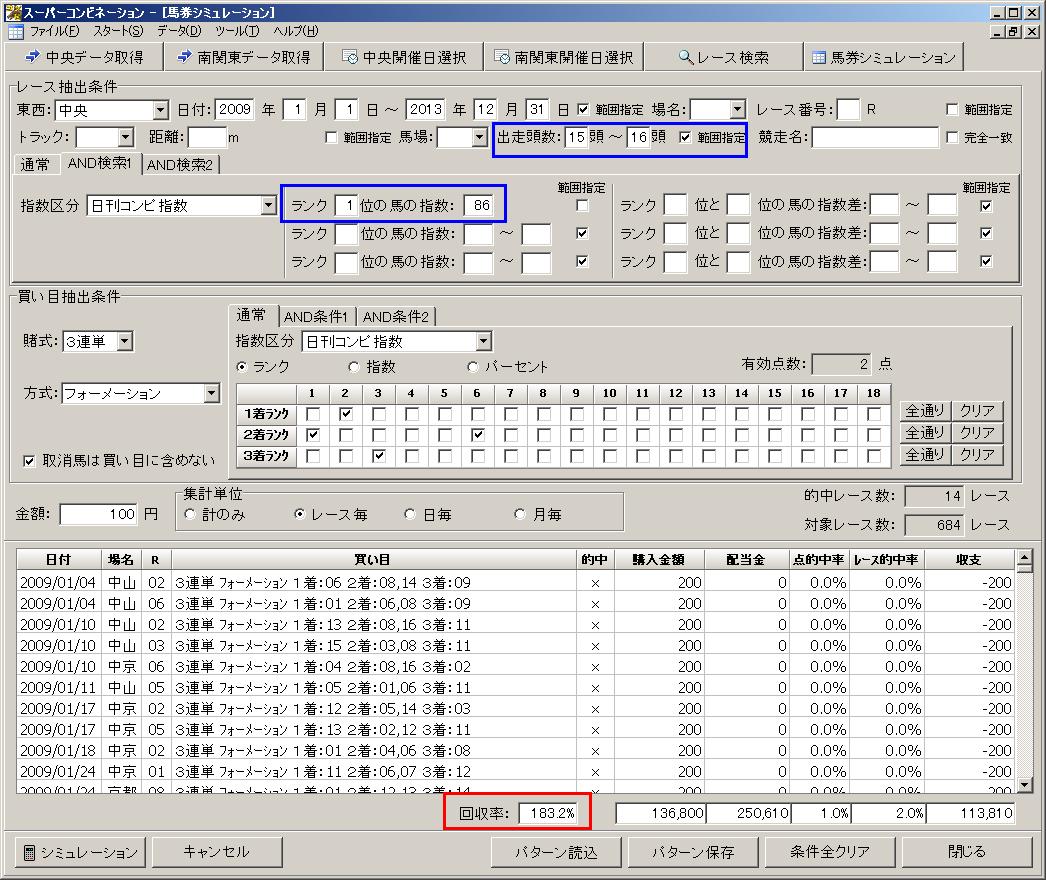 15〜16頭立てのレースで日刊コンピ指数の1位馬の指数が「86」の時に3連単フォーメーションの儲かるパターンは以下の通りです。