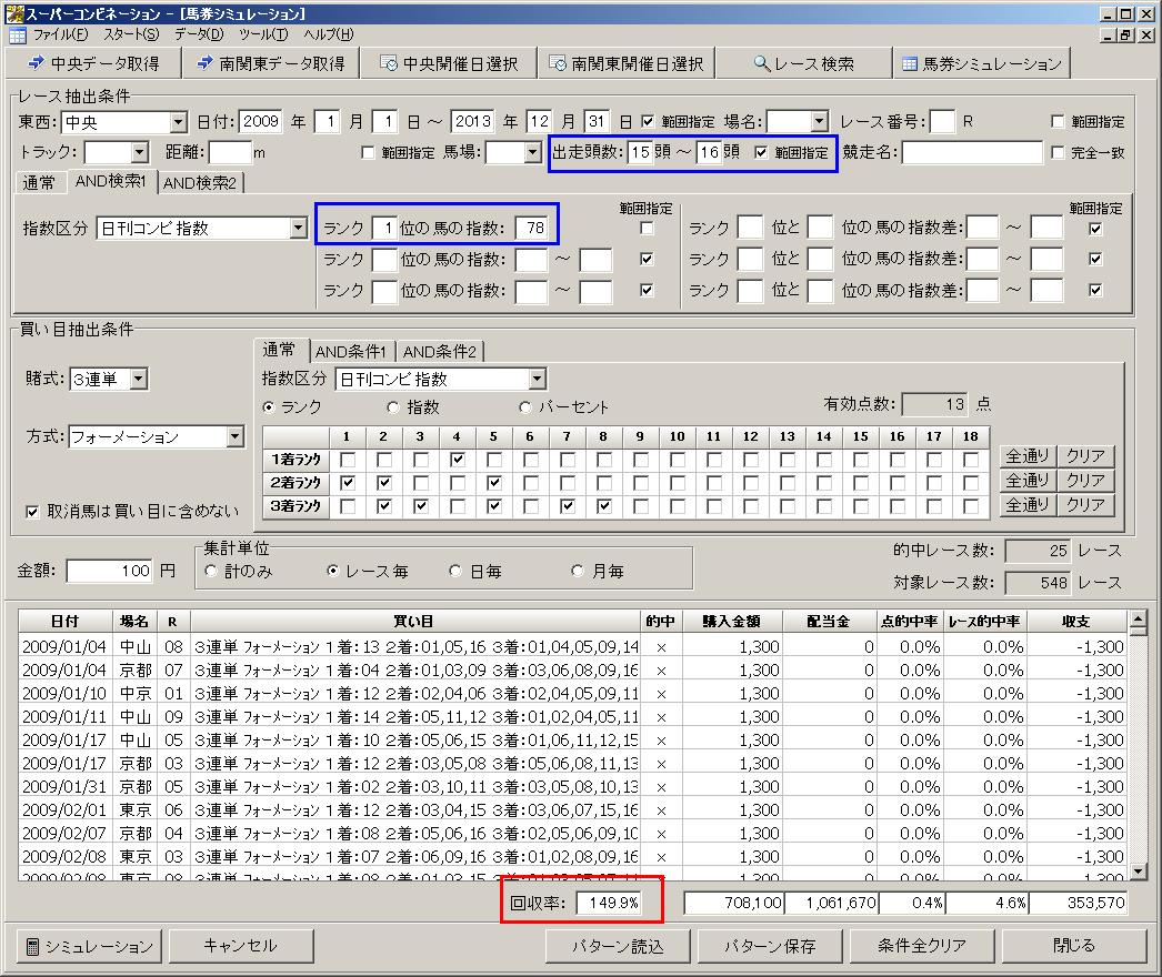 15〜16頭立てのレースで日刊コンピ指数の1位馬の指数が「78」の時に3連単フォーメーションの儲かるパターンは以下の通りです。