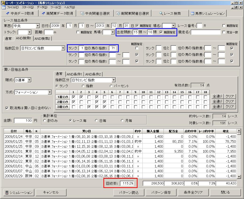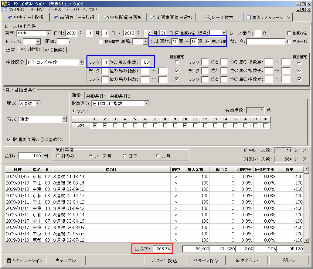 15〜16頭立てのレースで日刊コンピ指数の1位馬の指数が「88」の時に3連複の儲かるパターンは以下の通りです。