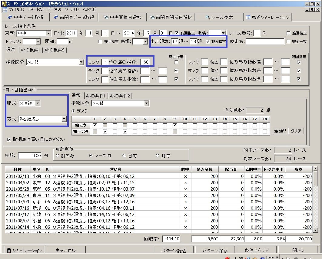 17〜18頭立てのレースでAB値の1位馬の指数が「68」の時に3連複2頭軸流しンの儲かるパターンは以下の通りです。