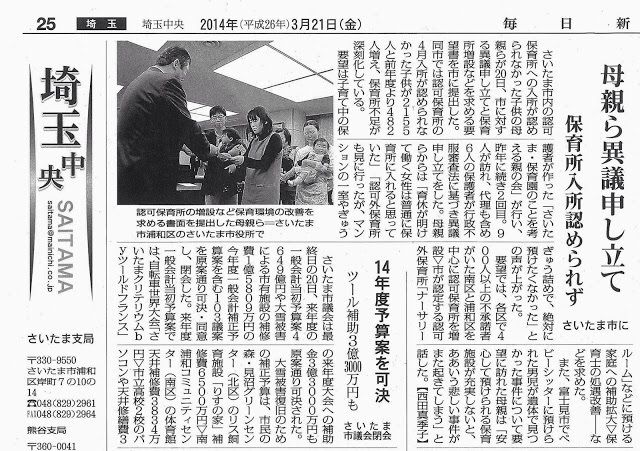 働きながら子育てをしている、さいたま市内の親たちの集まりです。 いま、認可保育所に入所を希望してもに入れない人がたくさんいます。 待機児童問題、保育環境の問題をみんなで考えていきたいと思います。