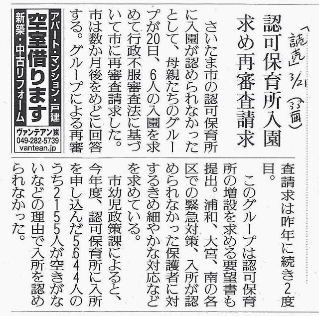 昨日、認可保育所への入所が認められなかった保護者みなさんの不服審査請求と、