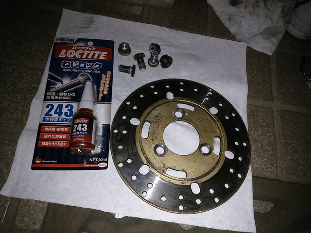 ディスクプレートに付着していたブレーキダストを有る程度綺麗にして、プレートボルトにはネジロック剤を使用し組み付けます