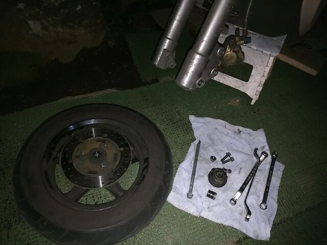 フロント周り(ホイール、キャリパー、アクスルシャフト、メーターギア)を取り外しました