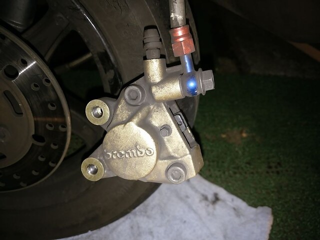 これでフロントホイールを車両にを組み付け、キャリパー、フォーク周りのブレーキダストを清掃し、更にブレーキパッドを新品に交換し、車両に組み付けて完了となります