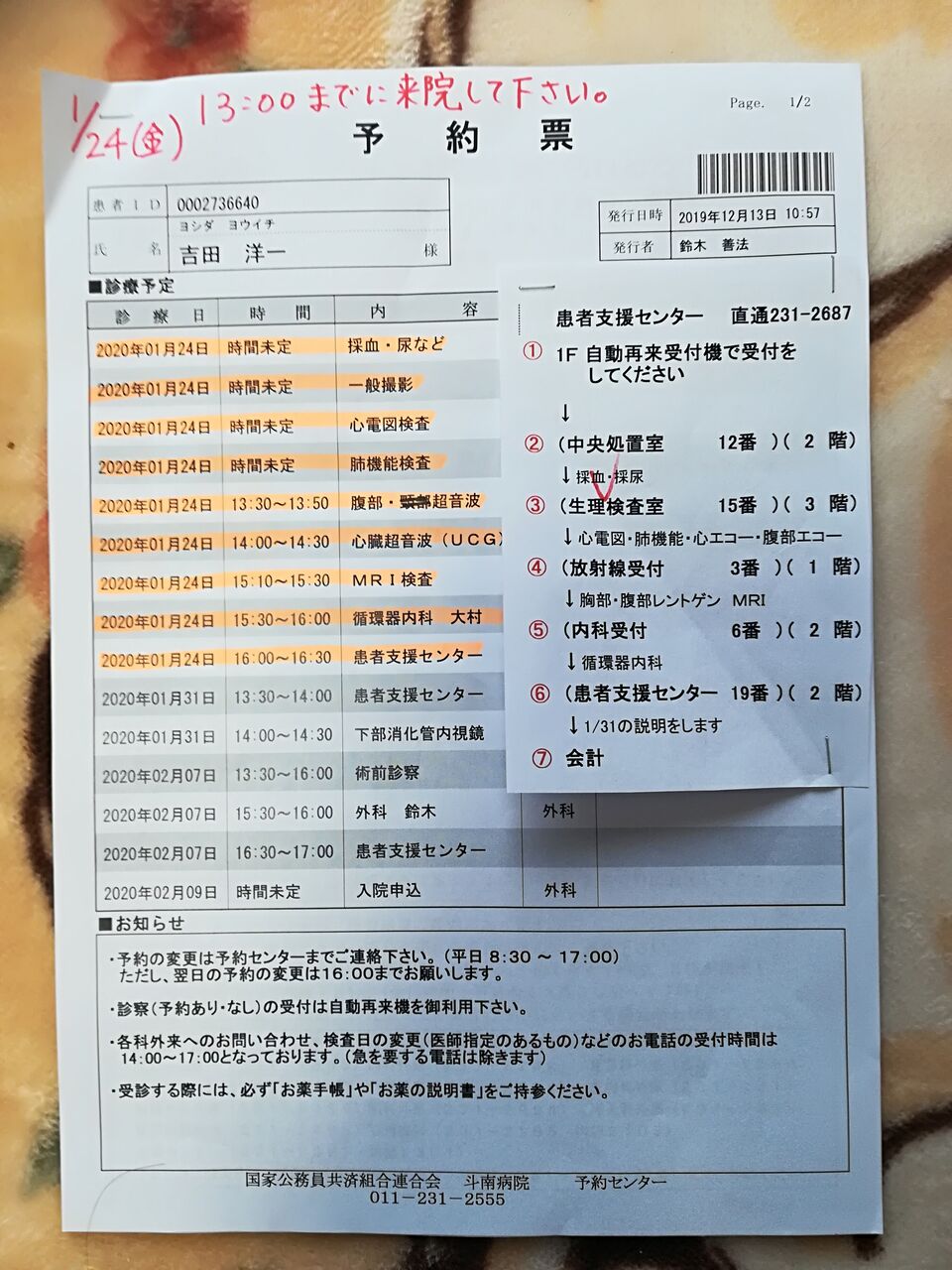 まず採血は5本。次にレントゲン、そして心電図・肺機能・心エコー・腹部エコーと続き、MRI検査で検査は終了。そのあと、内科医の問診があり、最後にこれからのスケジュールを聞いたのです。
