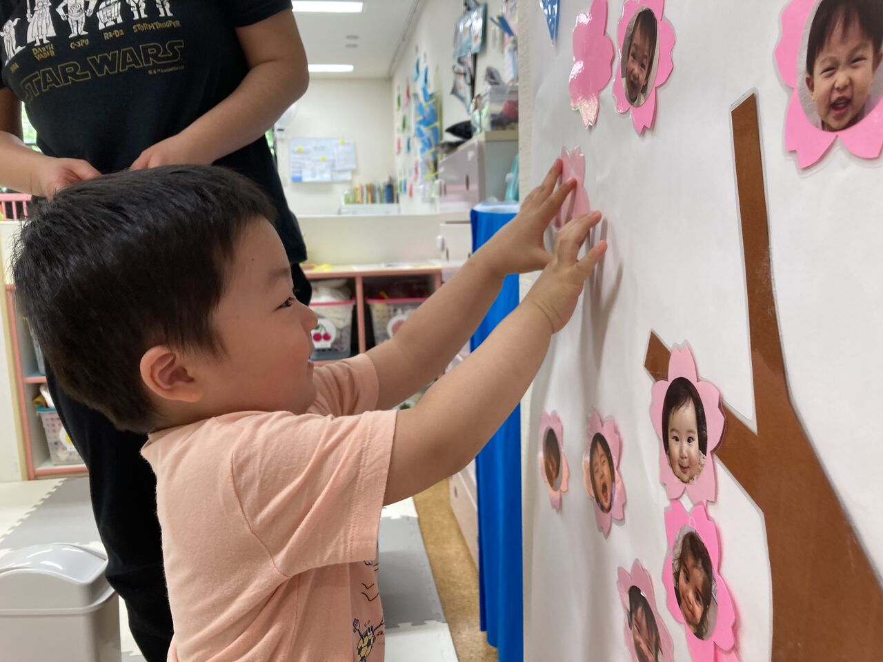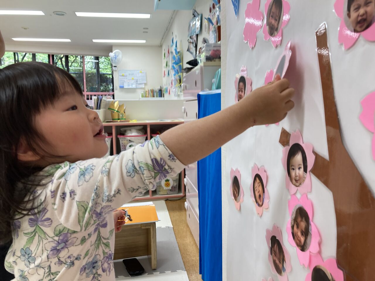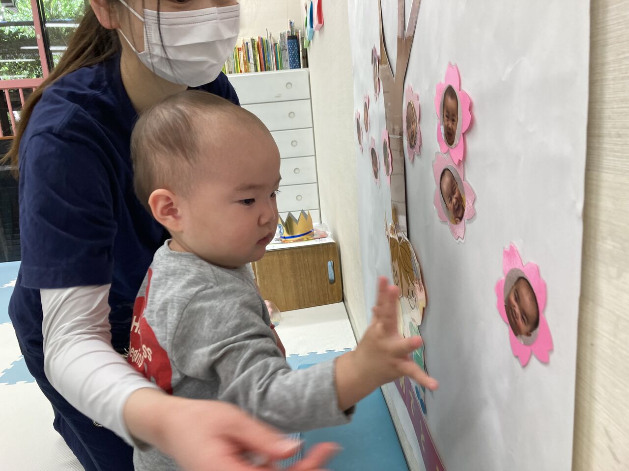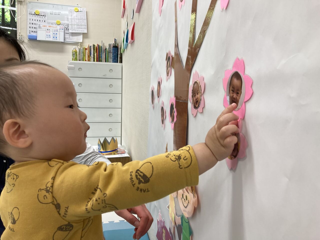 1歳児も、会の中で自分の顔写真を桜の木に貼り付けました。