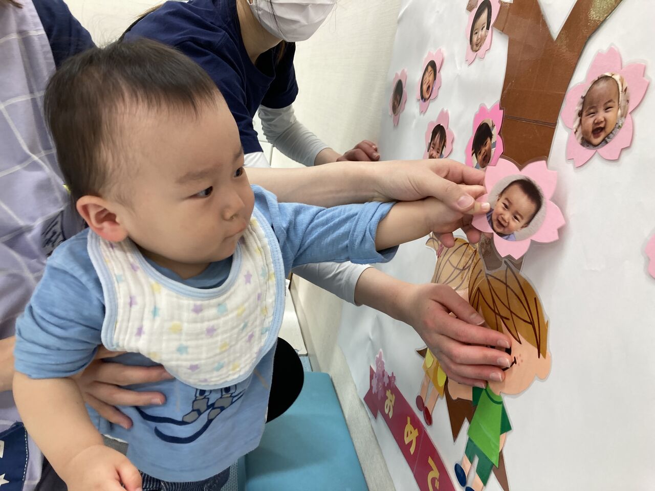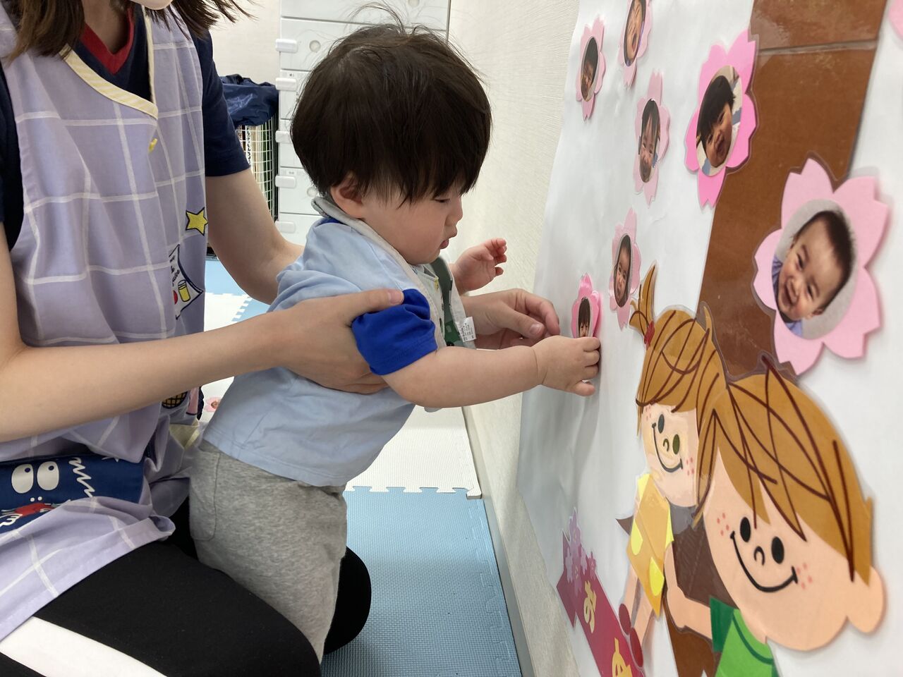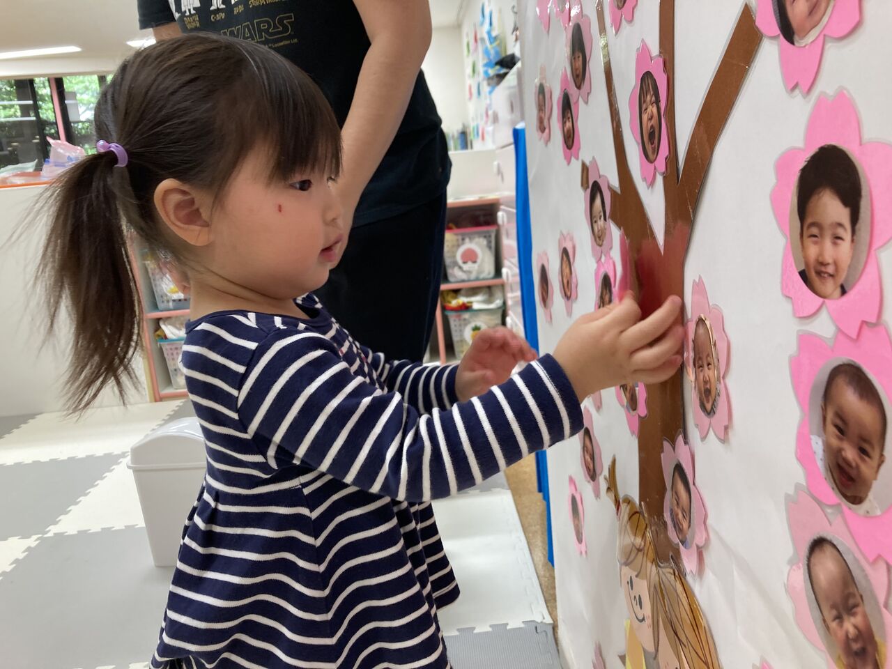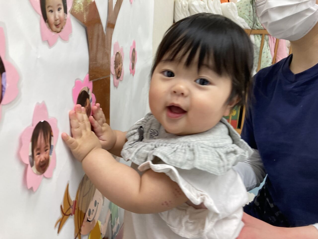 1歳児も、会の中で自分の顔写真を桜の木に貼り付けました。