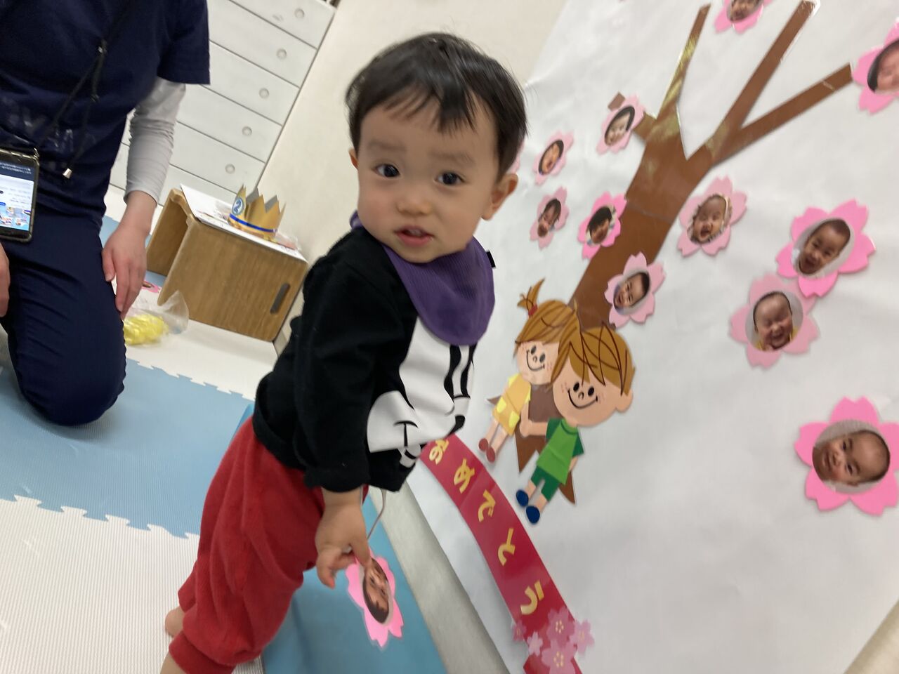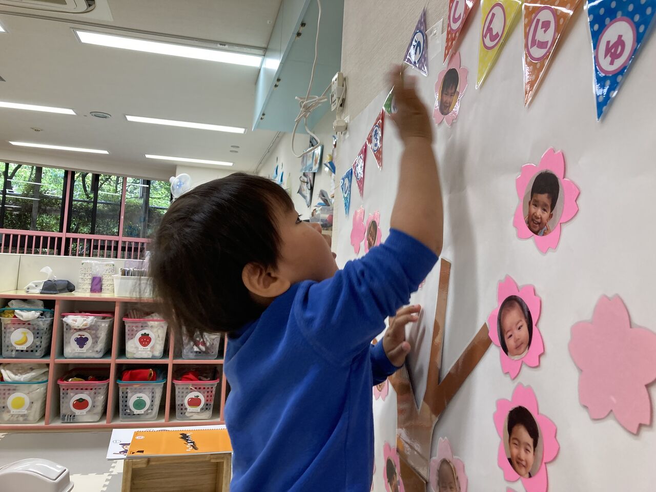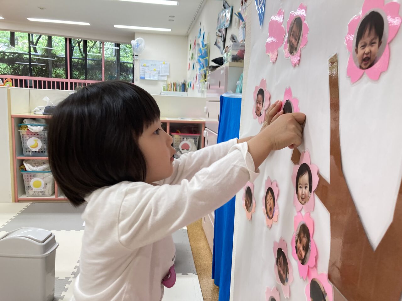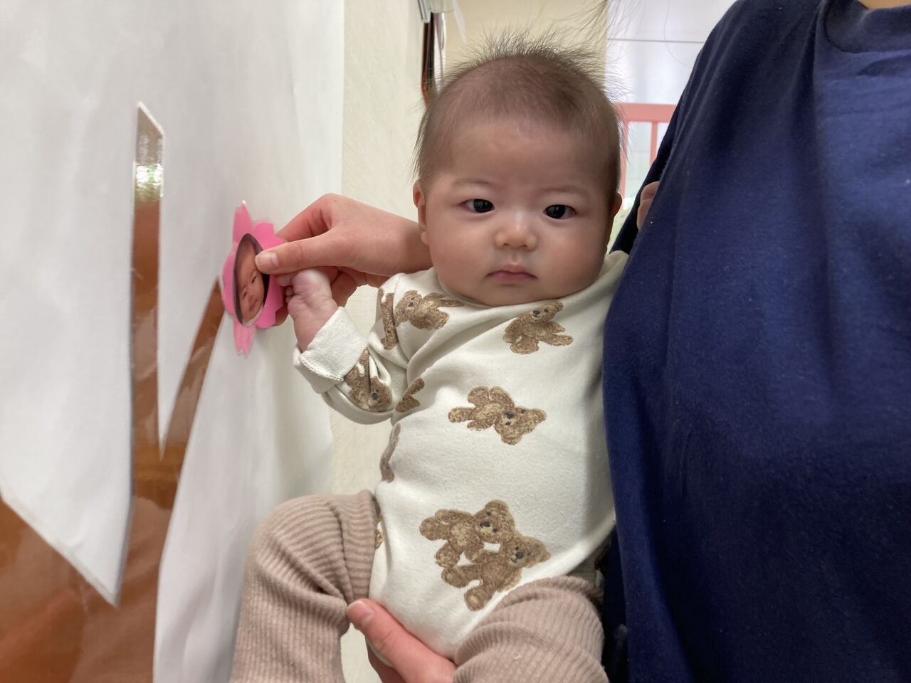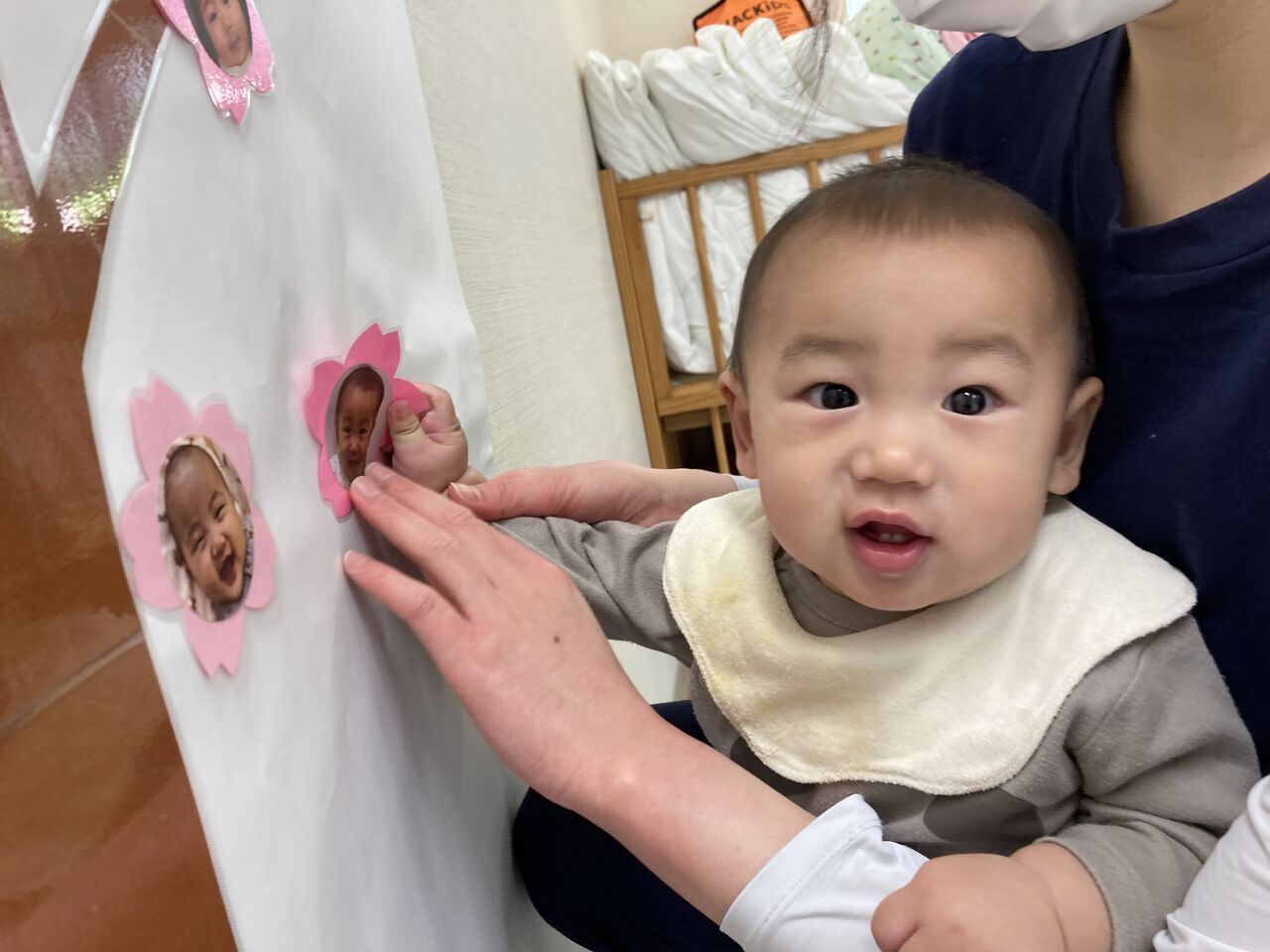 1歳児も、会の中で自分の顔写真を桜の木に貼り付けました。