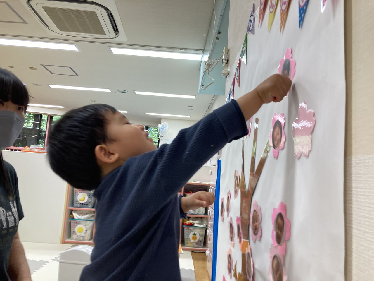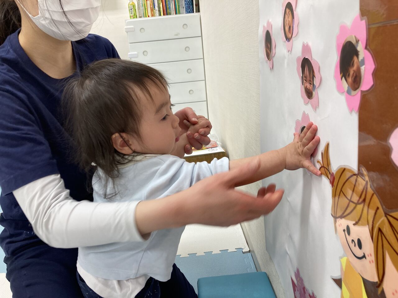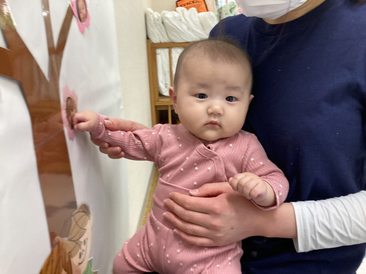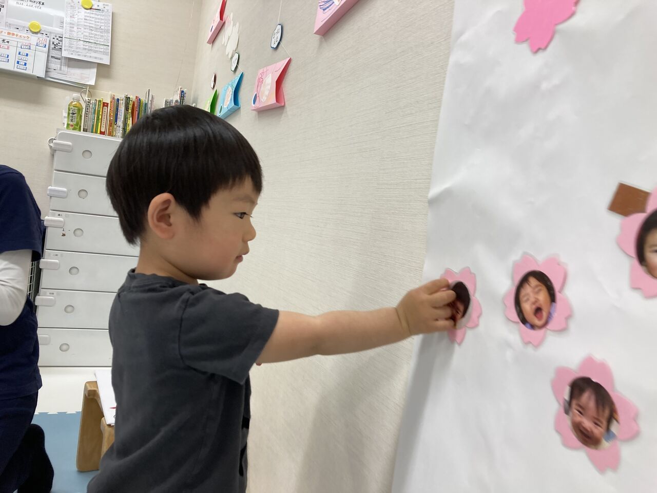 1歳児も、会の中で自分の顔写真を桜の木に貼り付けました。