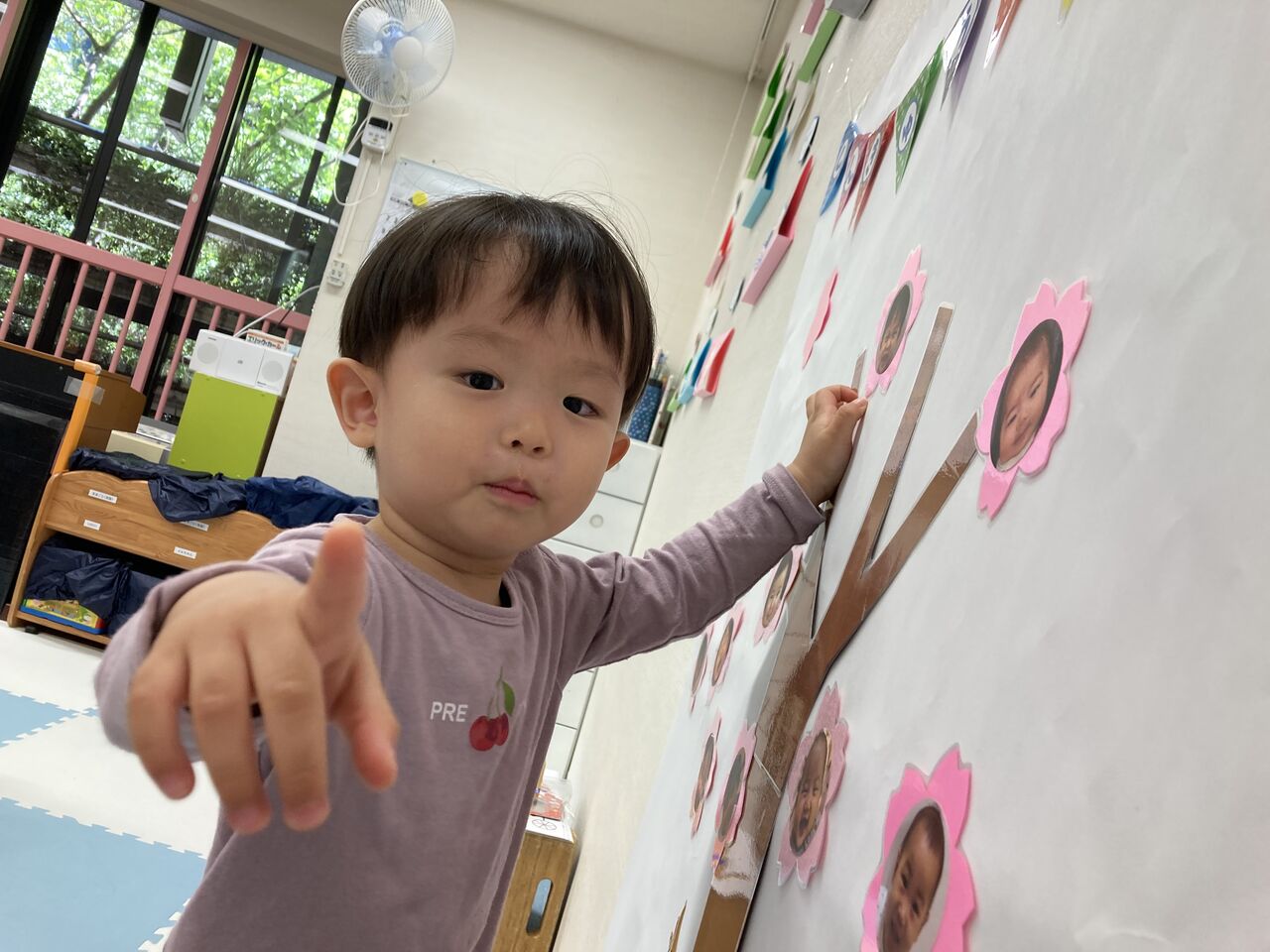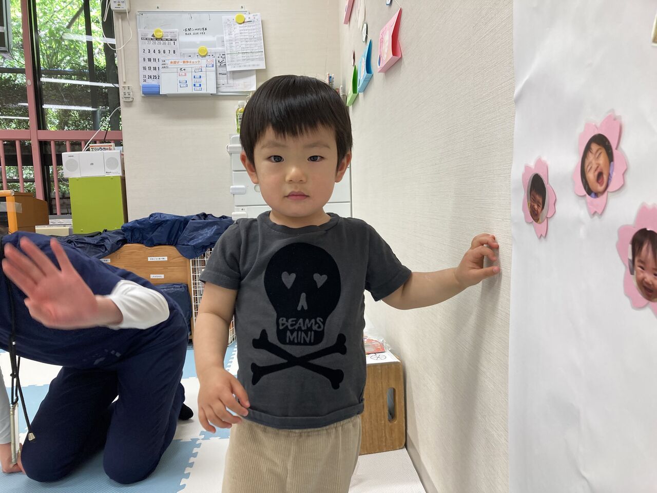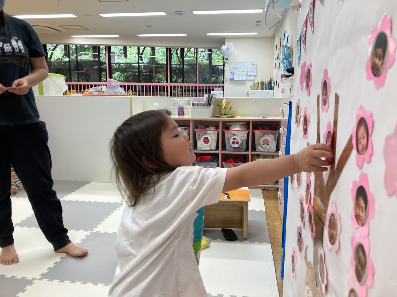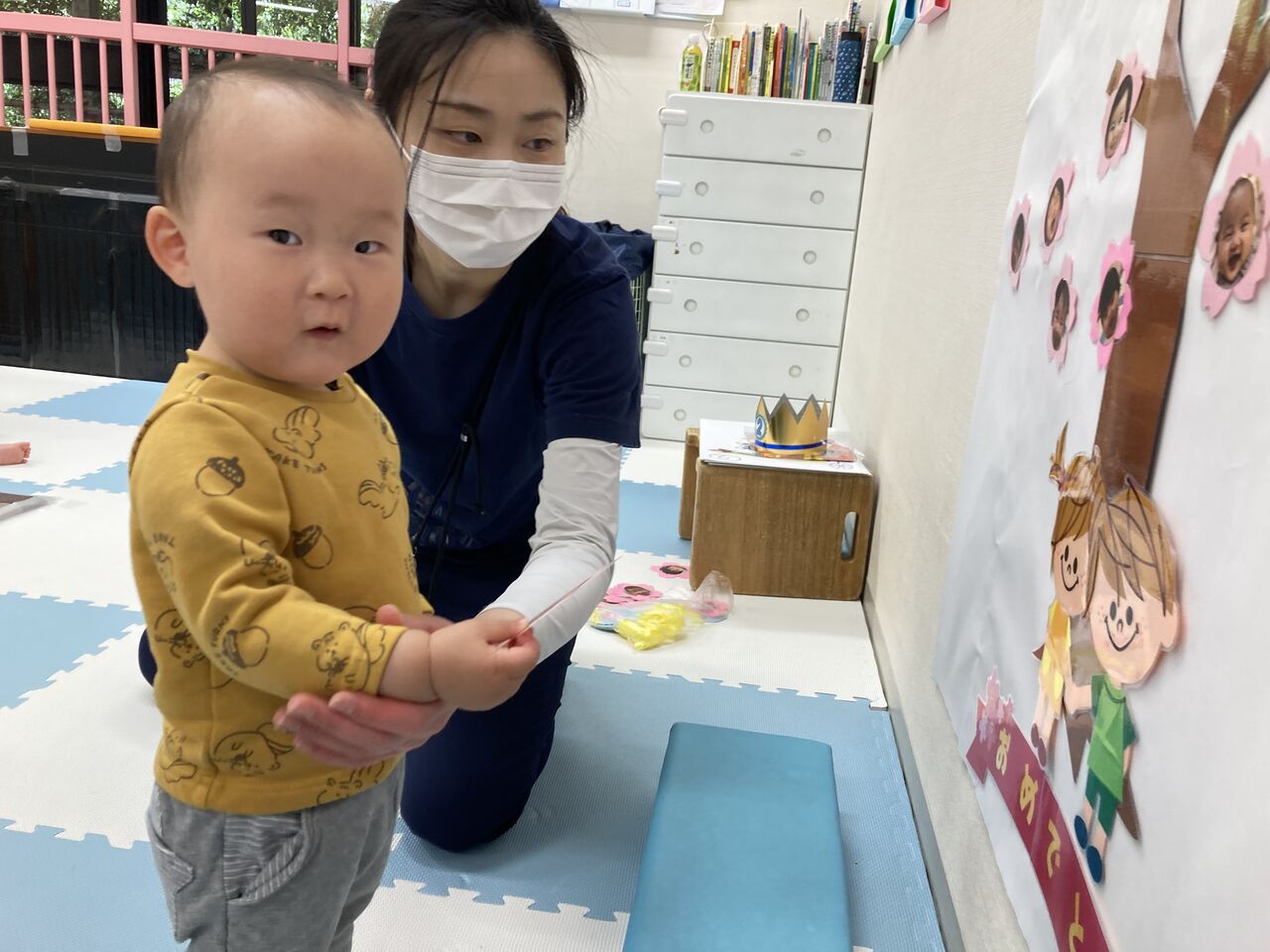 1歳児も、会の中で自分の顔写真を桜の木に貼り付けました。