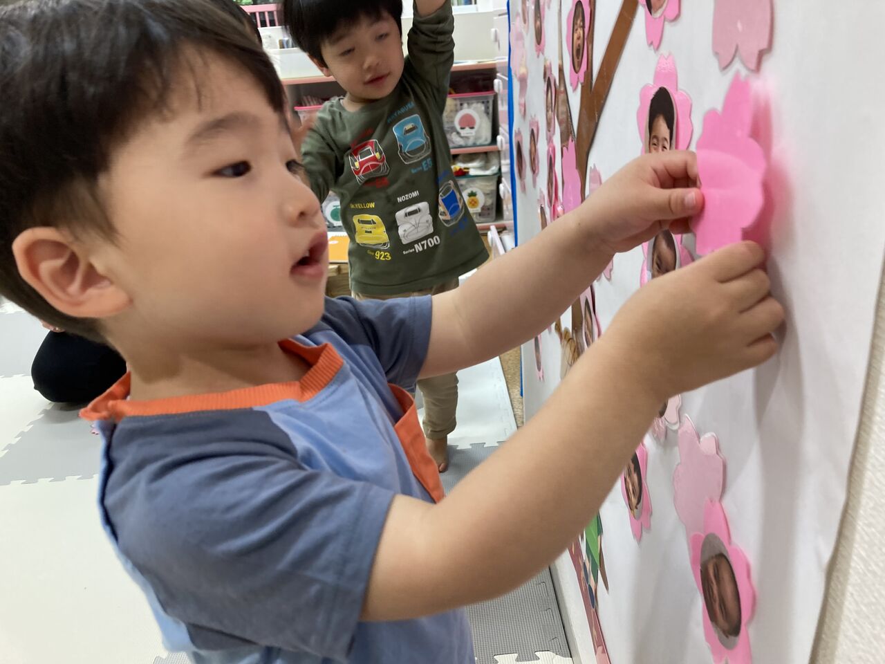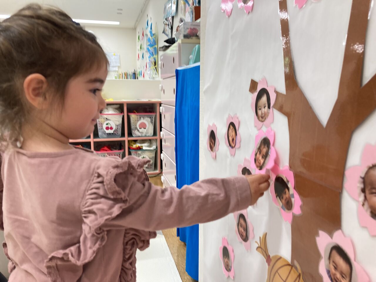 0歳児→1歳児→2歳児と顔写真付き桜の花が貼られ、完成しました。