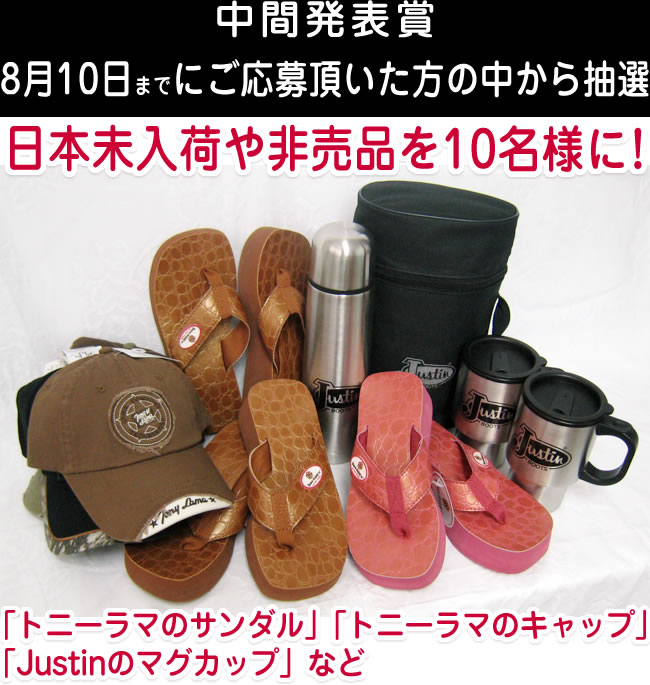 「早く」にご応募頂いた方への特典、中間発表賞と致しまして、トニーラマ、ジャスティン社の「日本未入荷品」や「非売品」をプレゼントさせて頂きます!