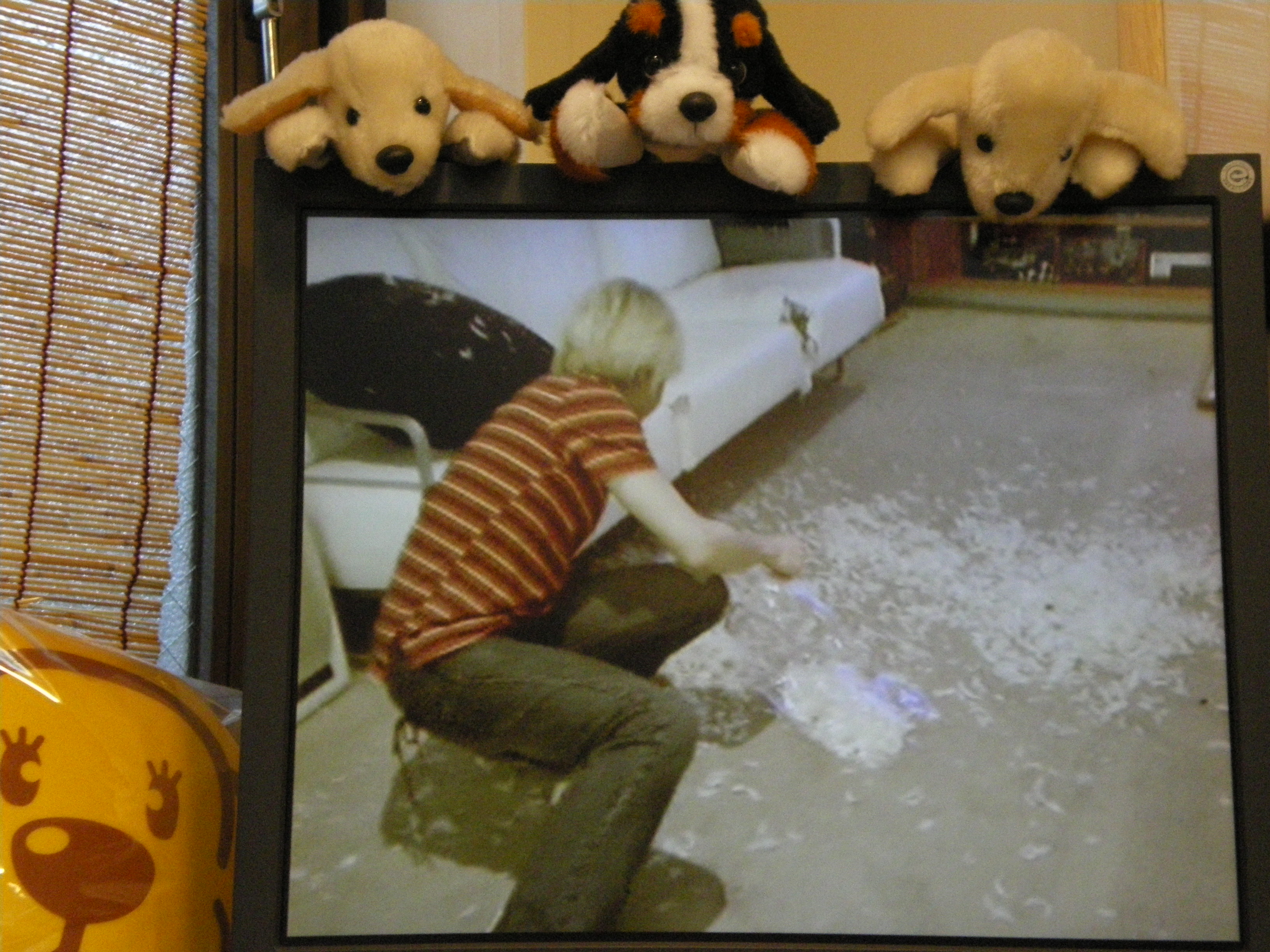 何をしてるかというと、破壊王じょんじょんがクッションかな?の中の羽を撒き散らしちゃって、それを一生懸命集めてるところ(笑)