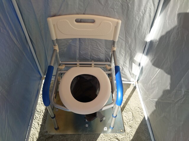 バールでマンホールの蓋を開き、その上に土台となるプレートを置き、洋式型のフレームを組み立て、便座をセットします。座面フレームにスリープを取り付けて、先ほどの土台プレートに固定をすることにより仮設トイレが出来上がります。その上から、プライバシー確保のための自立式パーソナルテントを被せ、マンホールトイレの設置が完了しました。