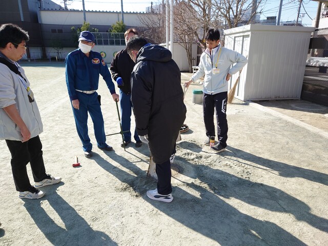 当日は、まず校庭でのマンホールトイレの設営作業から始まりました。