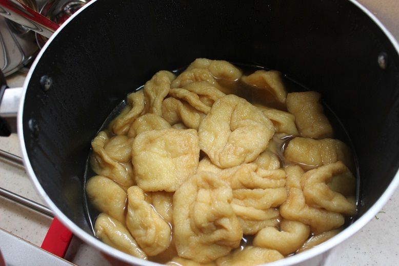 アゲも前の晩から水炊きして、余計な油分を落として行きます。