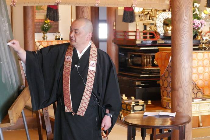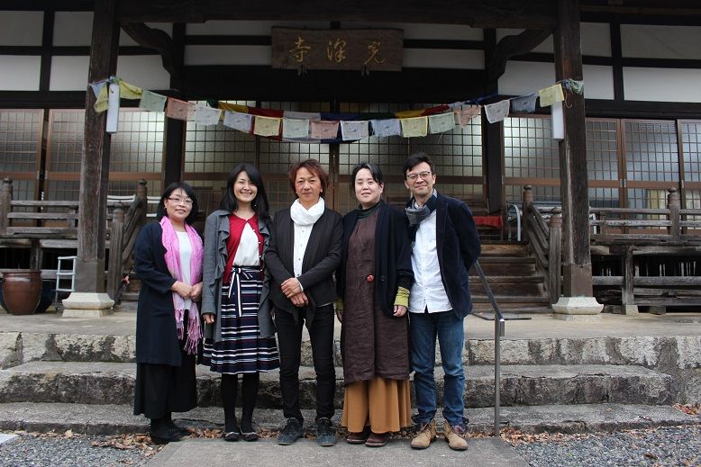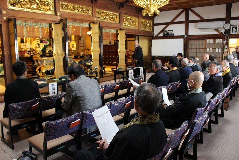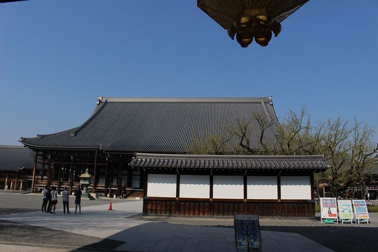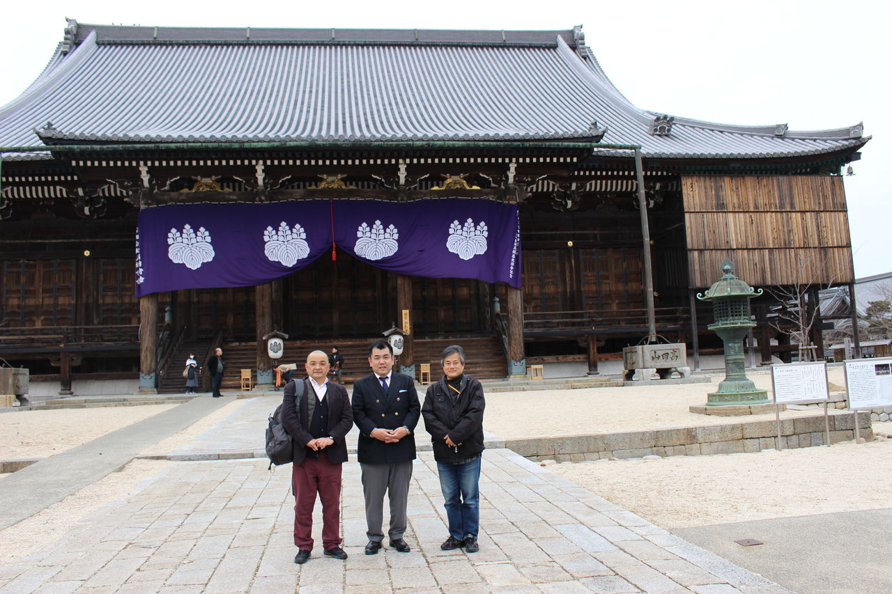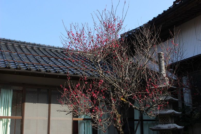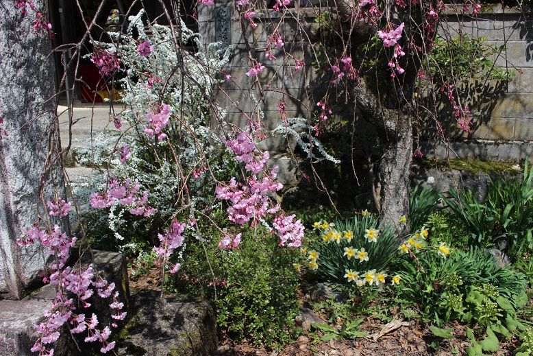 山門前の枝垂れ桜。そこに水仙もユキヤナギも咲いている。