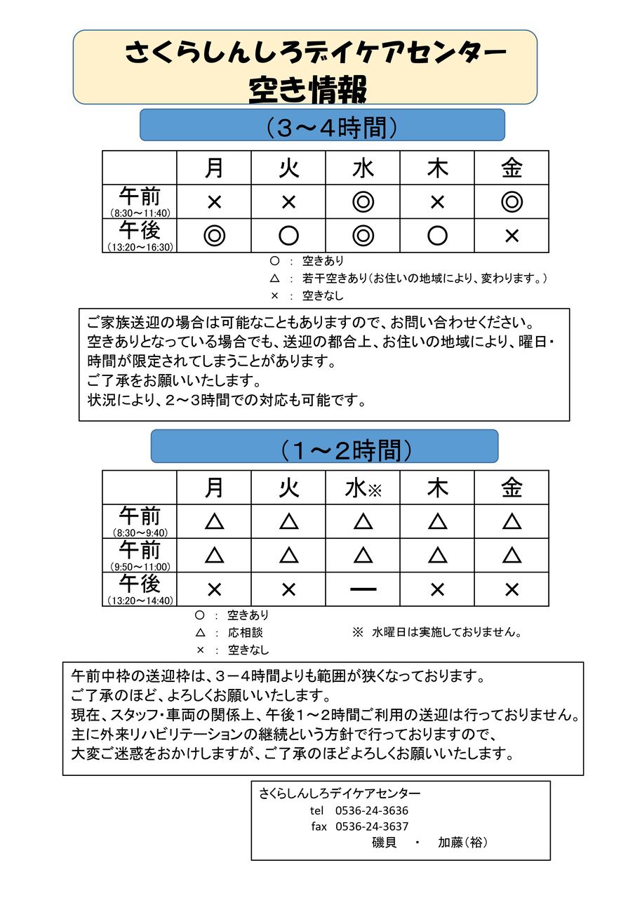 2023年08月23日 空き情報! 空き情報です。現在、夏季のためか午前中が定員いっぱいになっています。しかし!今後冬に向かって午後をご希望される方が増えますので、もし午後がご希望でさくらしんしろに興味をお持ちの方はぜひ! 今のうちにお越しください! カテゴリなしの他の記事 コメント コメントフォーム 名前 コメント 評価する リセット リセット 顔 星 投稿する 情報を記憶