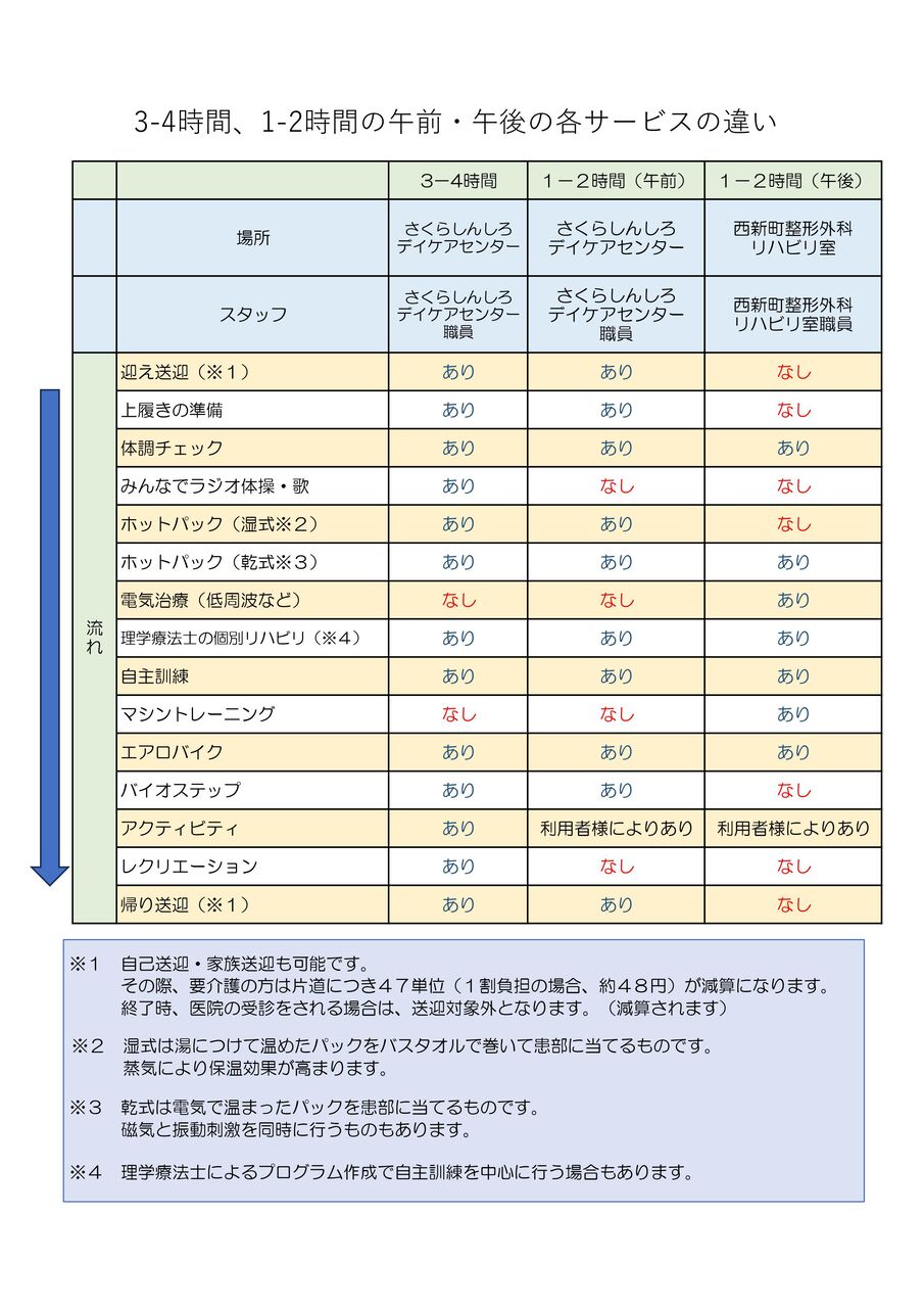 2023年09月05日 1-2時間の午前と午後、3-4時間の各時間の違いについて 今まで午後のみだった1-2時間のデイケアを8月から午前中も行うというご案内をさせていただきましたが、それぞれのサービスの時間帯以外で異なる部分がいくつかあります。ややこしいところもあると思うので表にしてみました。参考にしていただけると幸いです。 ご不明な点は さくらしんしろデイケアセンター TEL 0536-24-3636 までお願いします。 カテゴリなしの他の記事 コメント コメントフォーム 名前 コメント 評価する リセット リセット 顔 星 投稿する 情報を記憶