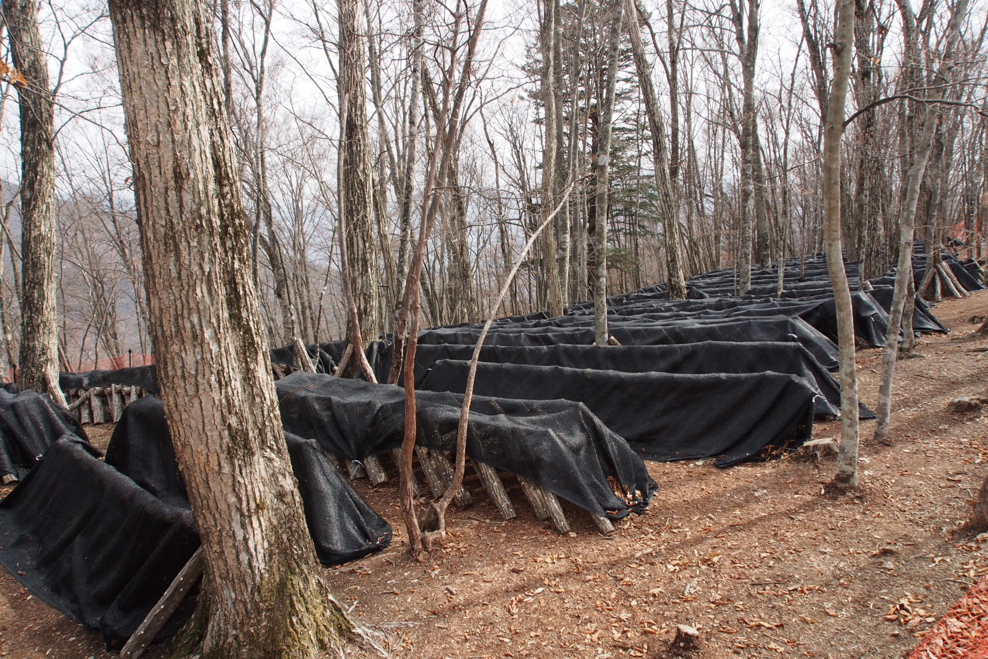 浅間尾根の一部で原木椎茸の栽培地になっていた。 伐採したクヌギを有効活用していますね。