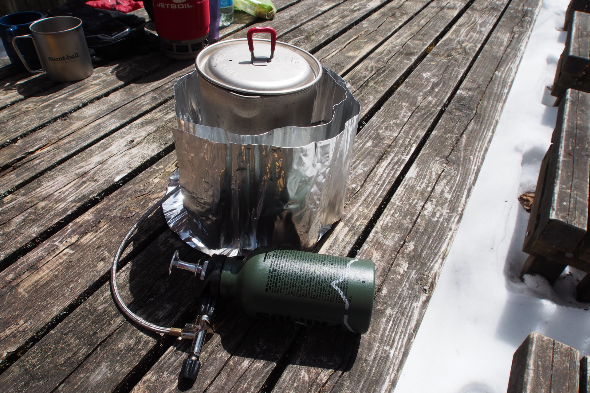 山頂は雪が腐ってるので、避難小屋まで降って腹ごしらえしよう。