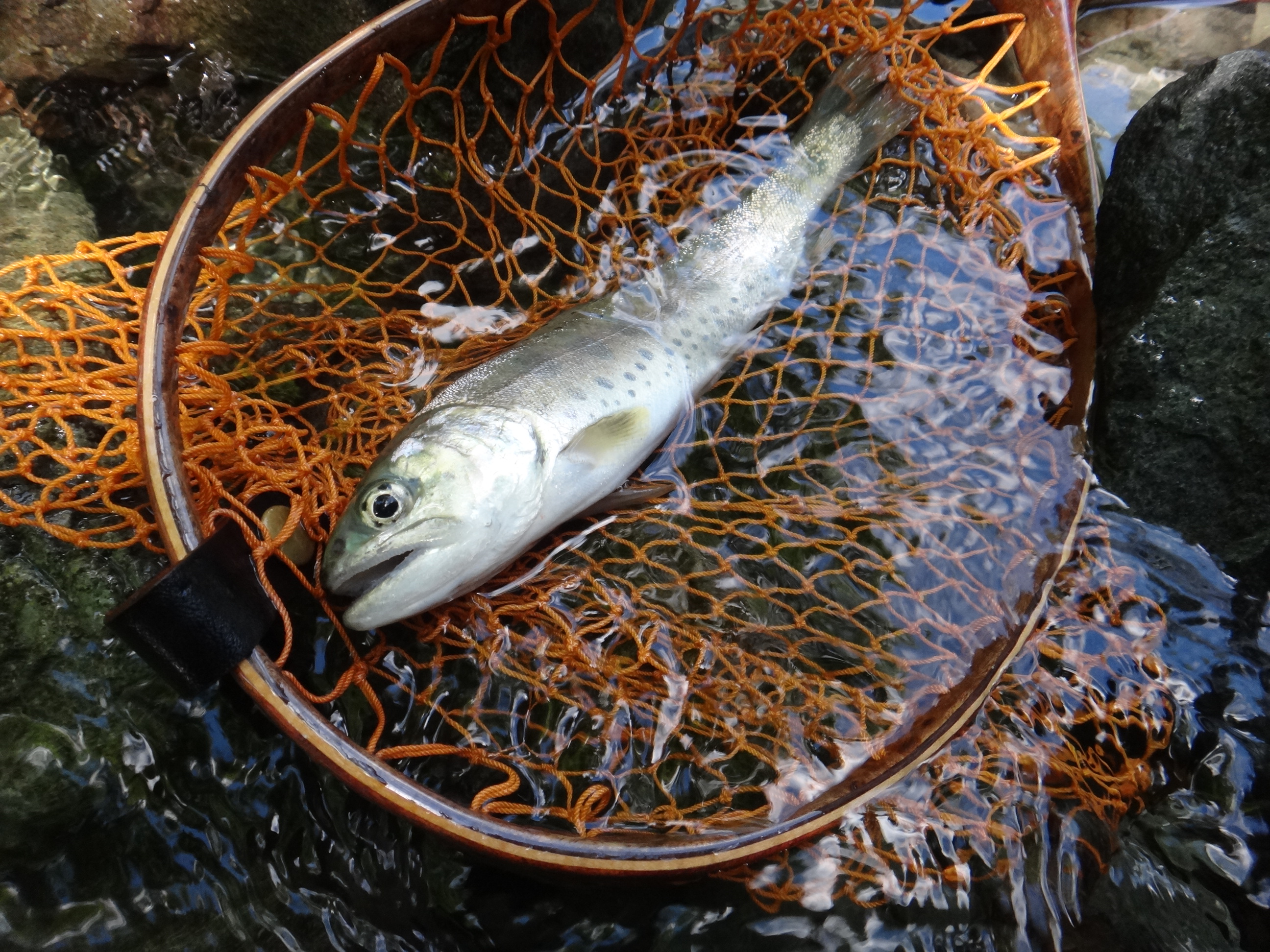 時折、腰下までの水深になりながらも慎重に降り、さらに尺超えの山女魚を釣り上げる。