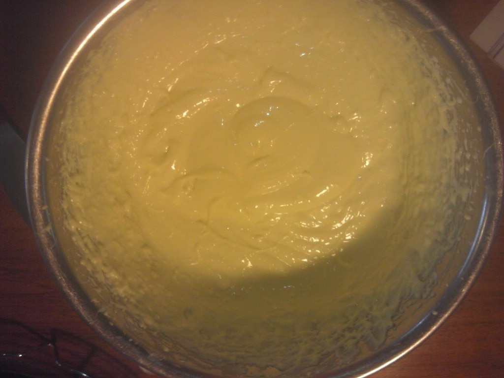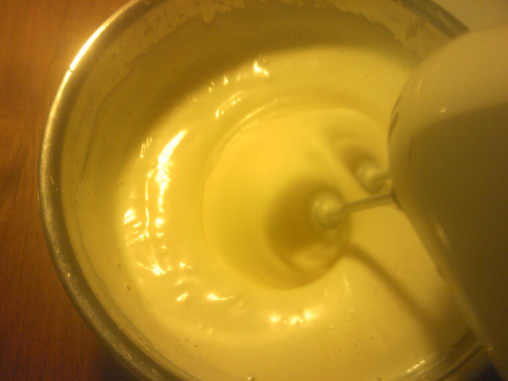 4、卵が完全に冷めて、気泡が細かくなり、白っぽくもったりとなり、ハンドミキサーですくったとき、2秒くらいしてから、もったりと落ちるまで、泡立てる。