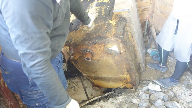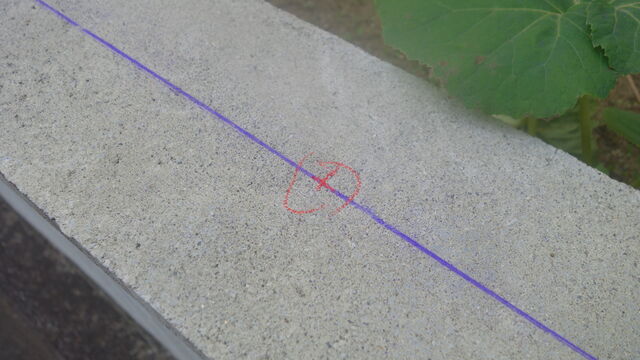 解体が終わると、既存の土留めにフェンスの柱を立てる穴を開けます。