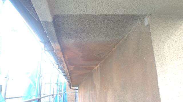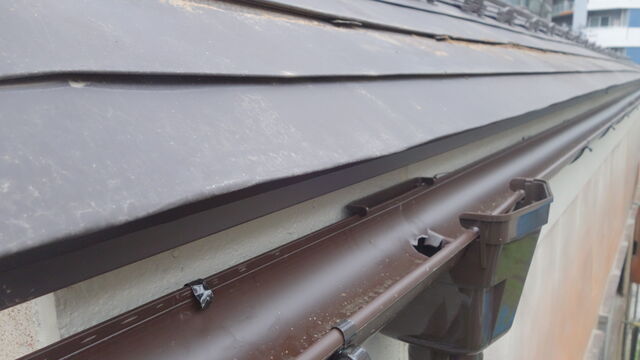 新しく軒先に唐草を取付け、軒樋を掛けて工事は終了です。