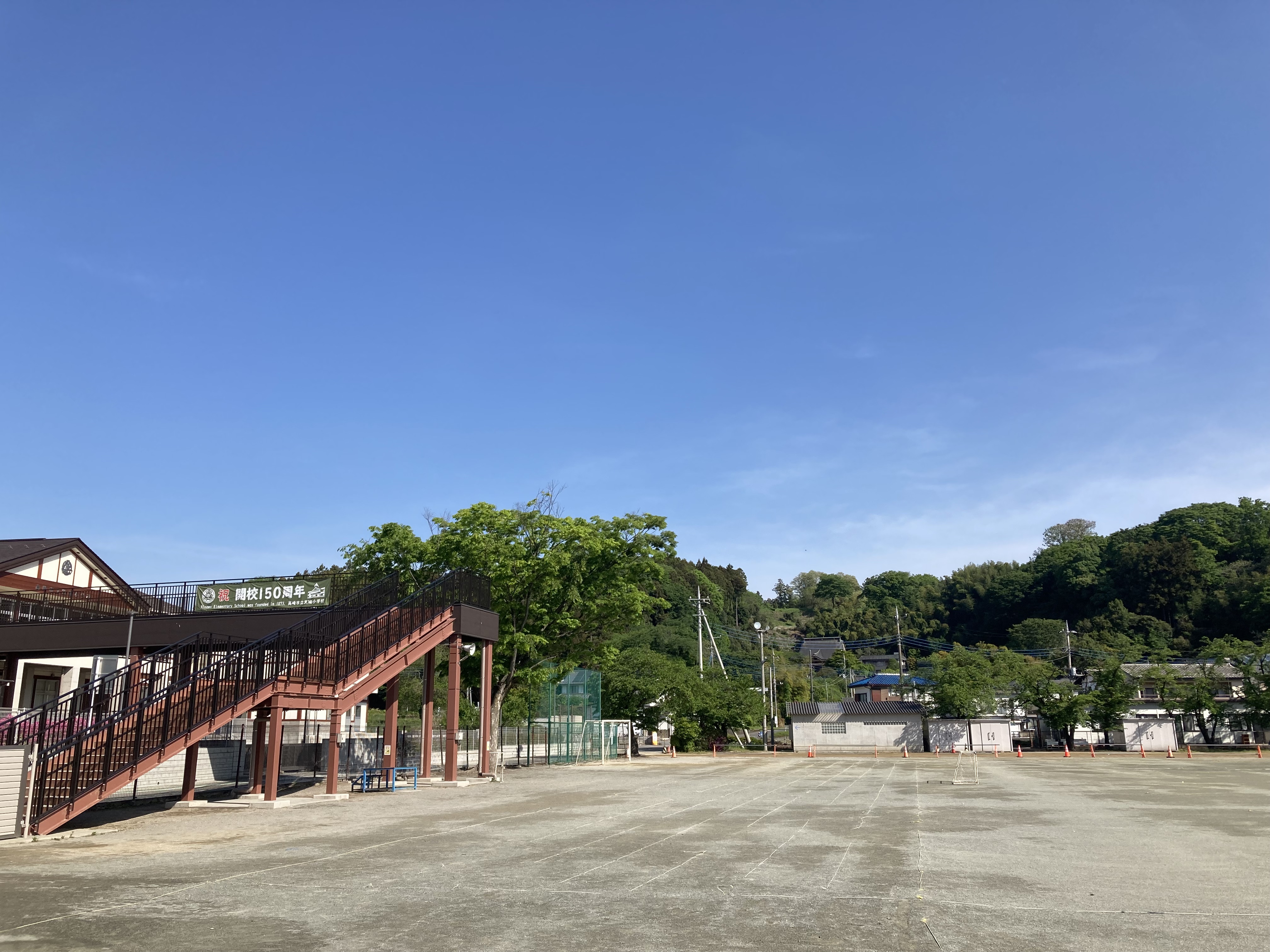 (校庭の奥に森のように見えるのが箕輪城です)