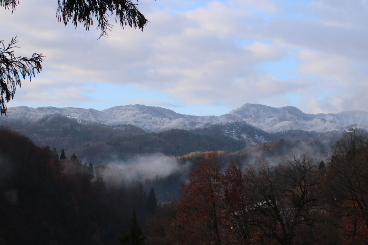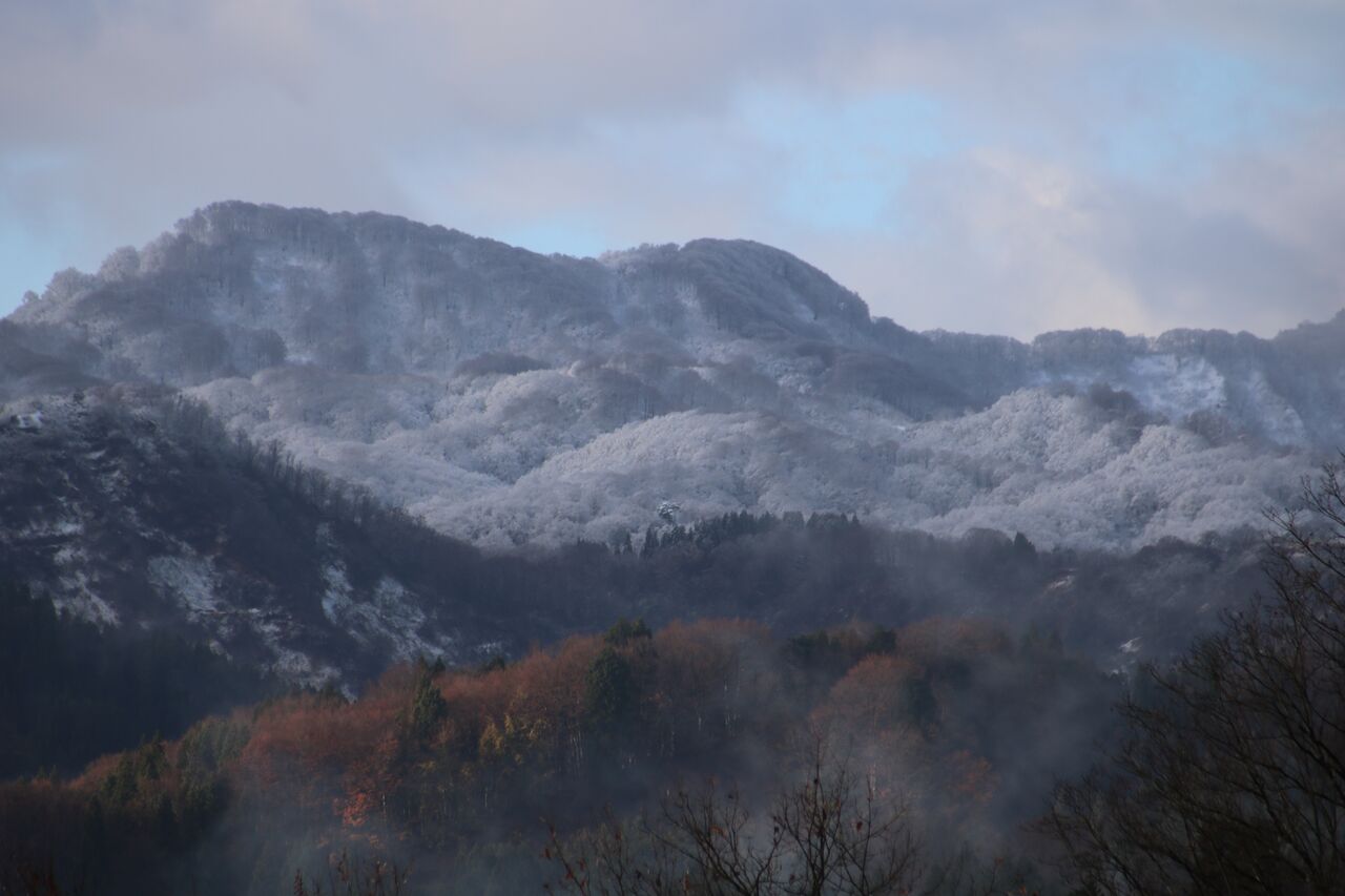 空気の冷えて水色の空に雪山 薄氷の冷たい山肌 花咲じじい爺さんの枝いっぱいの白い桜 巨大な山々に火山灰 手前の紅葉が(2枚目の画像)なければ海外の山のようです。 肺の中に張りつめた空気が入ります。