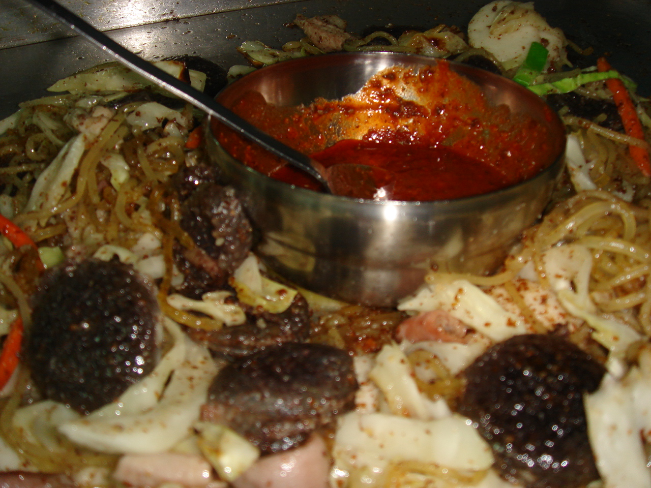 韓国語が飛び交う喧噪の中、スンデをほおばり
