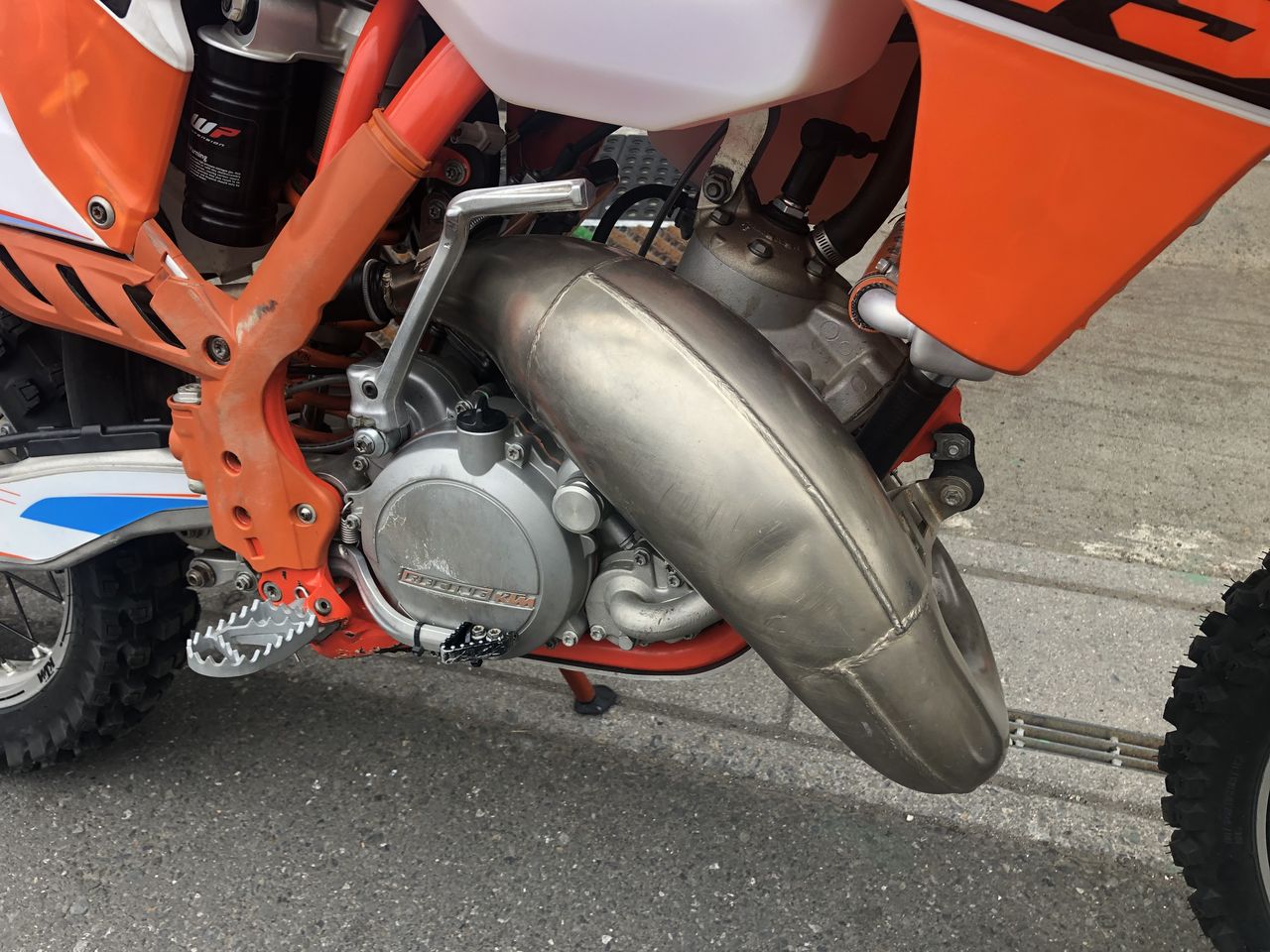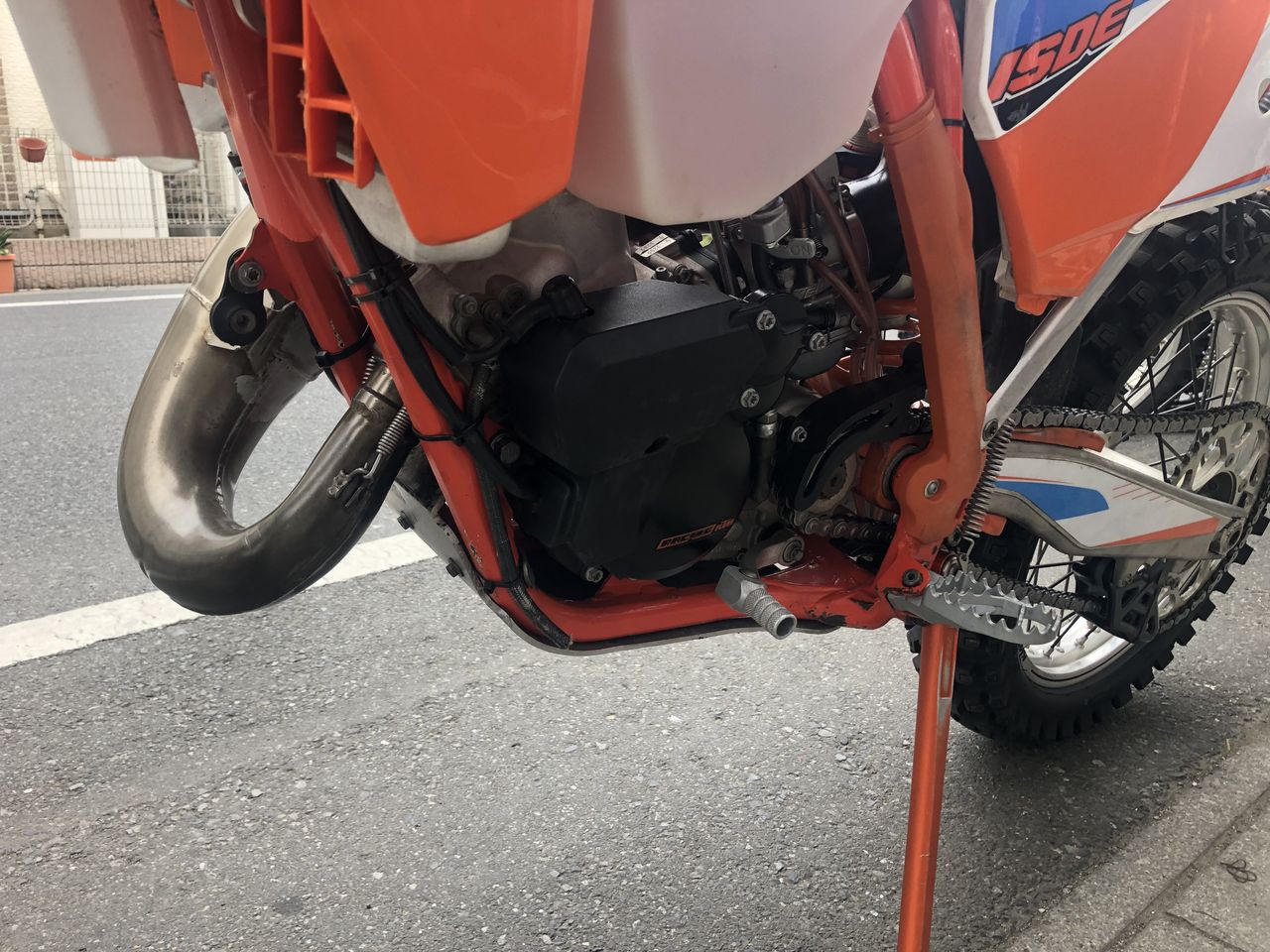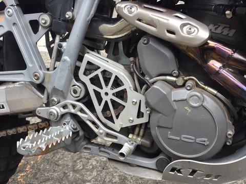 サイドスタンドも車高が上がっているせいか寝気味だったので少しずつ曲げてもらい、いい位置にしてもらいました。座面も拡げて補強してもらってます。 フットペグはパワーパーツのラリータイプですが、これはちょっと微妙でした。高速道路やノンストップで走っている分には足が疲れなくていいんですが、横に延びてる分押してる時や足を出したときによく引っかかるんです。 崩落したところを押していたときに引っかかっておっかない目に遭いました。やはりストップや押しがあまり無いラリー用です。