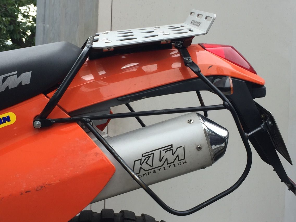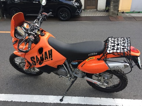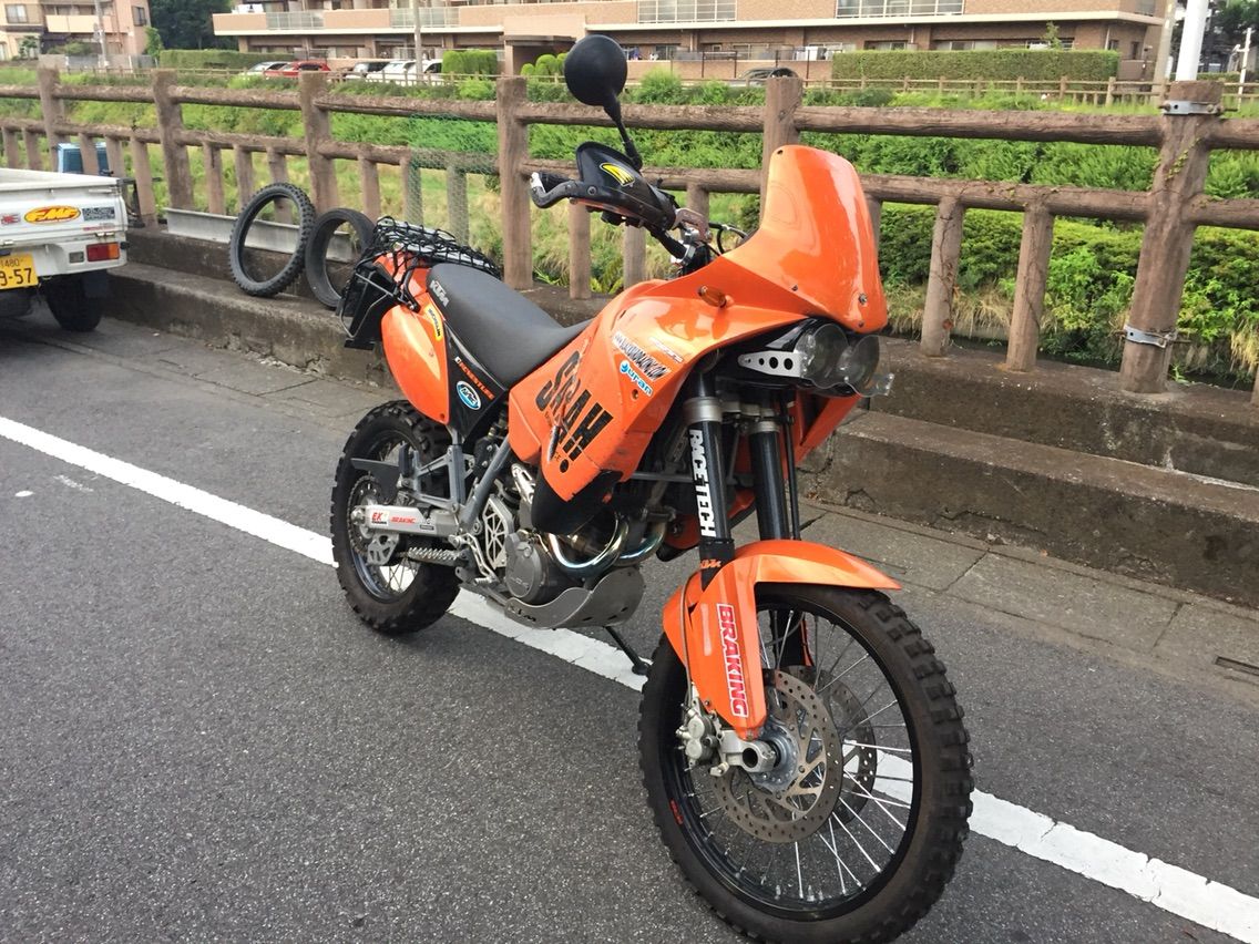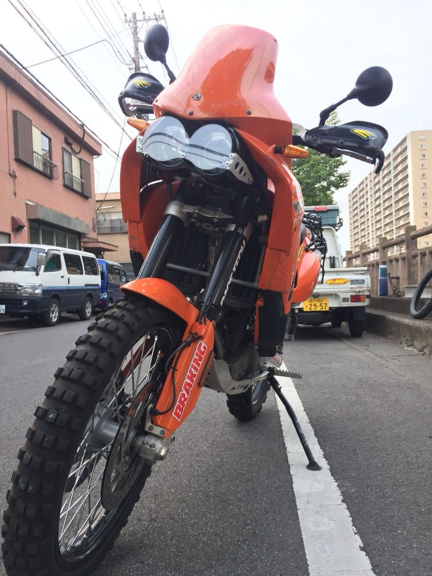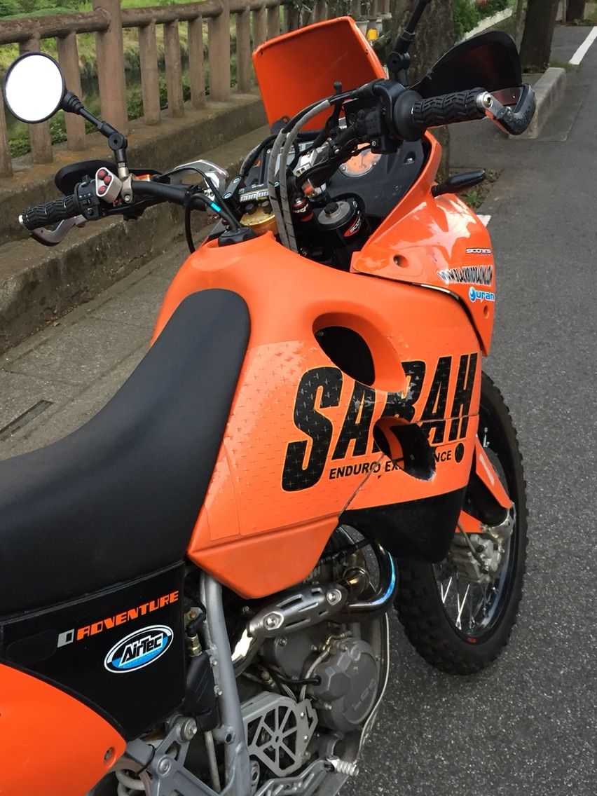 この度 何度目かの改装が終わりましたので今さらながらご紹介させていただきます。 名前は"KTM640アドベンチャー" ウチのバイクで一番デカいので "戦艦" と呼んでおります。 ちなみにBMW系は昔R1200GSに乗せてもらったときにガソリンタンクが本当に飛行甲板のように思え、「コレ 空母だな」と艦これも無い時代から呟いておりました。 さて、最初のオーナーがモンゴルラリーで使ったそうで、ガソリンタンクはFRP製ではなくPP製になっており、足周りもシャコタンが流行っている昨今に逆行して足長になっており、信号待ちでは常につま先プルプルしております。「えい!」ってされたら100ぱーコケる自信あります。