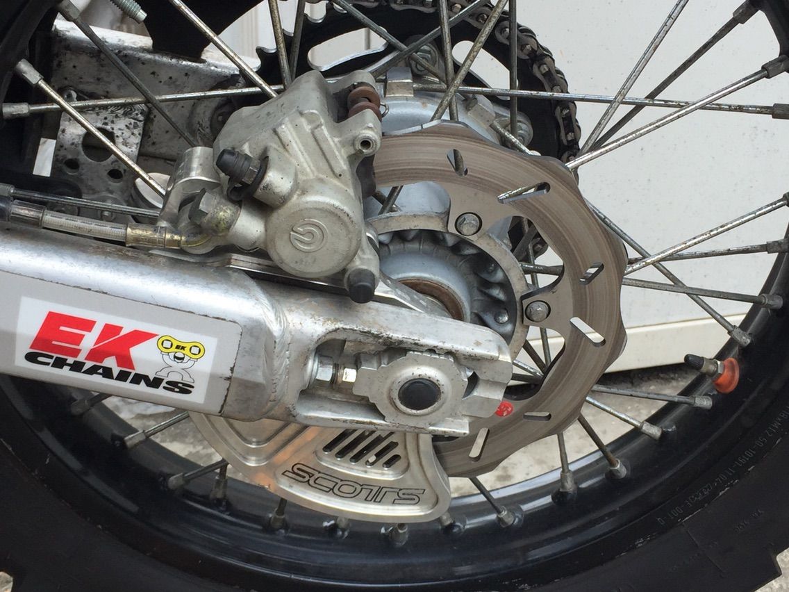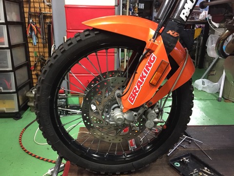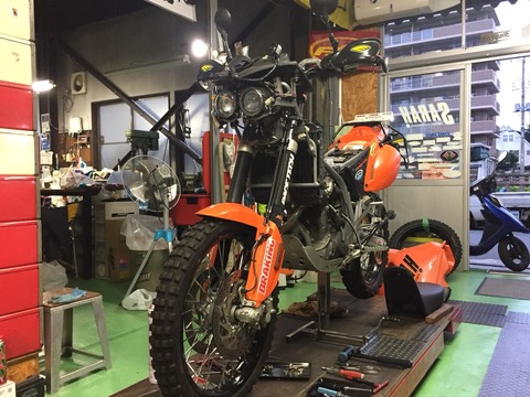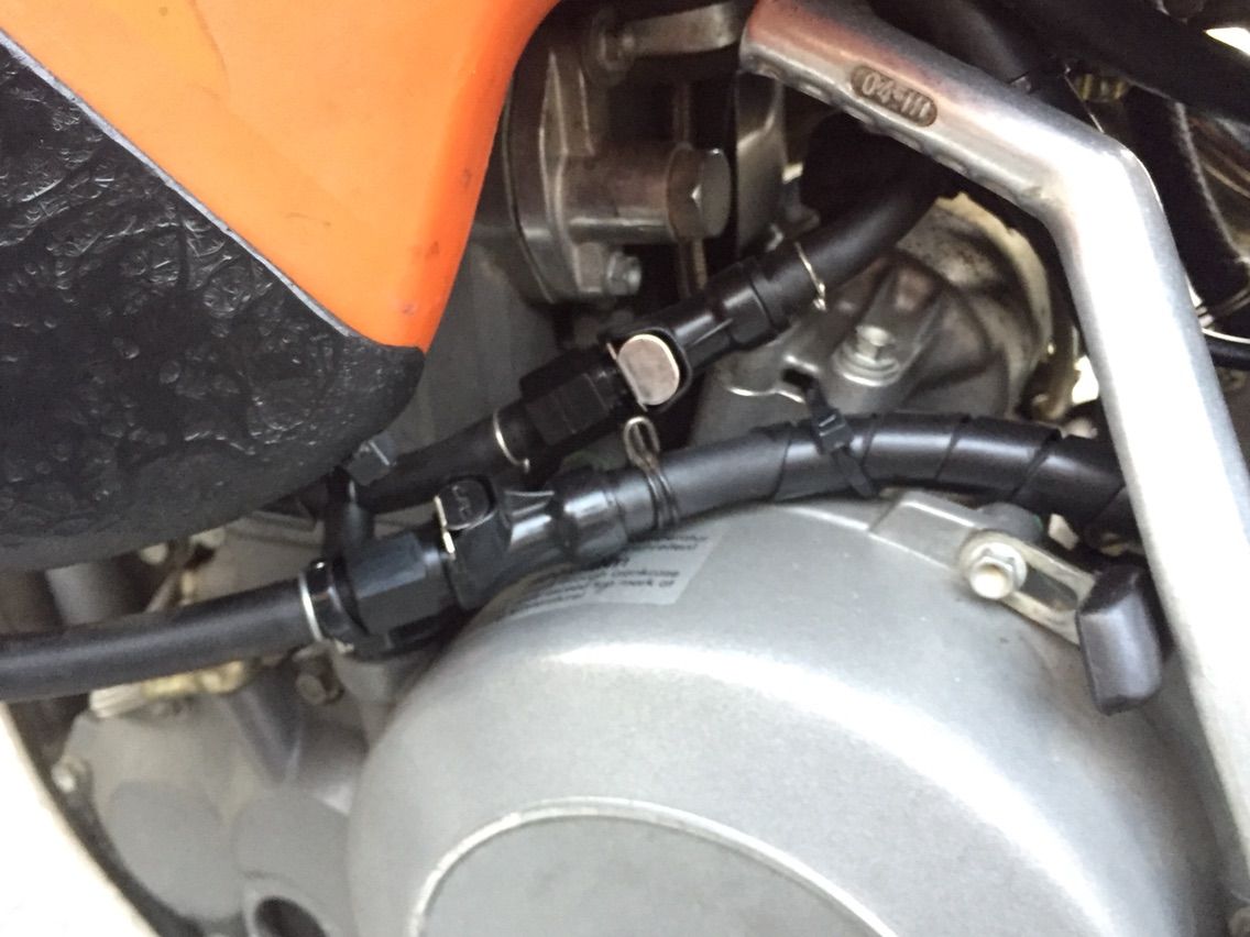改装は現在も進行中でございます。 クーラントのリザーバータンクの増設、ガソリンタンクを外し易くする為のホースの加工、リアブレーキも前回ダートで引きずりながら走ったらすぐベーパーロックしたので(走り方変えろって?)、冷却性を上げる為ウェーブディスクに交換してフルードのdotを変える予定です。