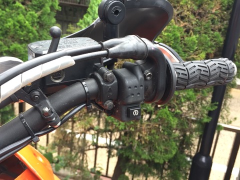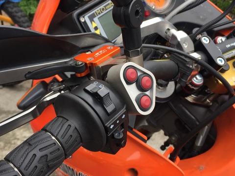 セルボタンは最初、内側のカウルに付いてる変なボタンだったので(ノーマルがわからない)何故かウチにあったCRF-Xのセルボタンに換えてもらいました。ハンドガードはサイクラのCRM(重巡級、戦艦級、打撃系におすすめ)でこれも取り付けにひと工夫していただきました。 ちなみにブレーキリザーバーの手前にあるレバーはチョークですが、これもノーマルではないらしいです。