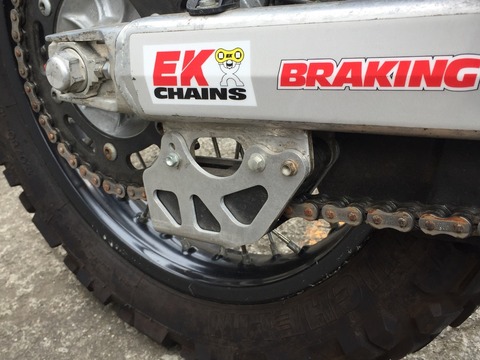 チェーンガイドは黒い部分に切れ目を入れてもらい(ボルト穴のスペーサーも綺麗にカットしなきゃなので自分でやろうとするとかなり大変。しかも一発勝負!)、チェーンを外さなくてもガイドだけ外せるようにしてもらいました(ちょっと頑張る感じですが)。外側のカバーはフサベルの流用です。
