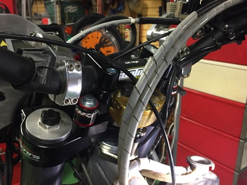 次にステム周り。 ステダンはもともと付いてたのですが今回トップブリッジごとスコッツのものに換えてみました。 それまでハンドルバーの上にステダンが付いてたのですがスコッツのサブマウントタイプにしてステダンがハンドルバーの下に来ました。 これでSSERの国内ラリーのハンドルの上はバーパットだけ! のレギュレーションにもいけるでしょう(いつ出るか知らんスけど)。 ハンドルももうちょっと高くしたかったのでちょうどいいです。 ただここでお約束の問題が…。ハンドルを高くした分デコンプワイヤーがキツくなってしまいました…。社外のお約束ですね。
