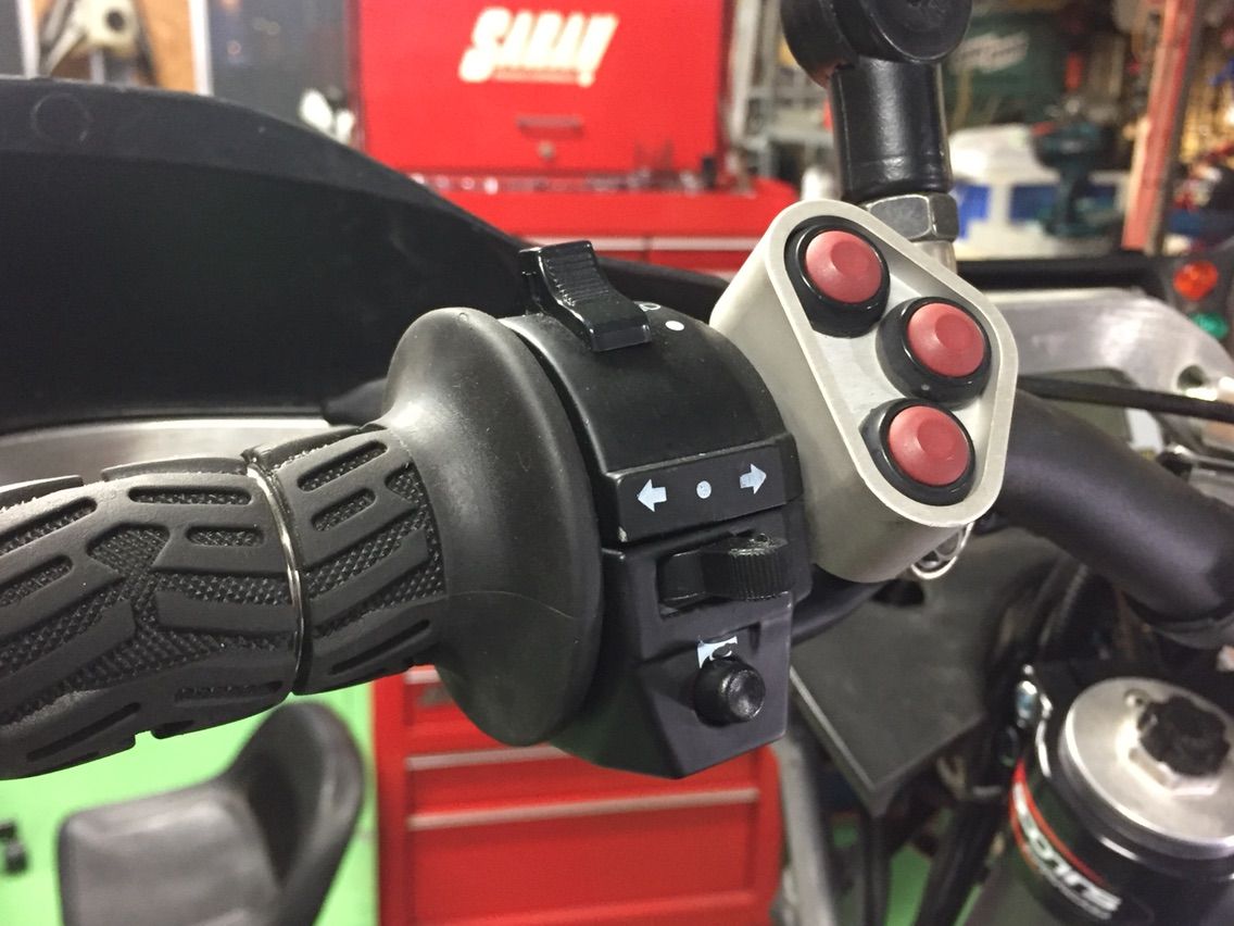 そして保安部品のスイッチボックス。 こちらはDRCのものに換えてみました。 もともとのは知りませんが ウチに来たときにはEXC系のスイッチに換装されており街で使うとウィンカースイッチがすぐに壊れてしまいます。 まぁそういう頻繁に使うようなものではない一応のレースパーツですから…。 そしてここでまたお約束の問題発生。 ウチの戦艦、ライト二灯式でライトHiにするとHi Low同時に点灯します。Lowはウチに来たときから社外のHIDが付いており、Hiは多分ノーマル? DRCのスイッチボックスにはHi Low同時点灯の為の機能は無いということが分かりました。 ノーマルがどんなものか大佐もわたくしも全く知らず… かと言って同時点灯は捨てがたく、DRCのスイッチボックスはWRで散々使ってもヘタれなかったから信頼できるので… ということで悲しい目をしていたら、「実際走らせてみないとわからないけど、理論上はできるよ。」ありがとうございます! 大佐が間にダイオードを入れるなどして頑張ってくれました。