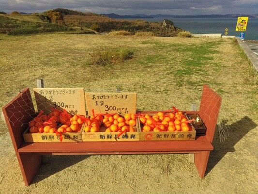 ビュースポットにミカンの無人販売。一袋購入。マジうまい。みずみずしく香りが高い。