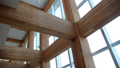 柱と梁の主要部分は、工場で鉄骨に集成材の耐火被覆を施したうえ搬入。